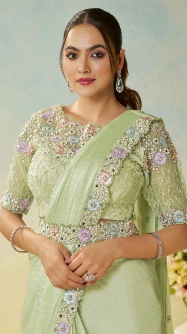 This exquisite two-tone Satin Silk one-minute saree combines effortless draping with a stitched Organza Tissue blouse featuring intricate four-sequence embroidery and premium multi-stone handwork.