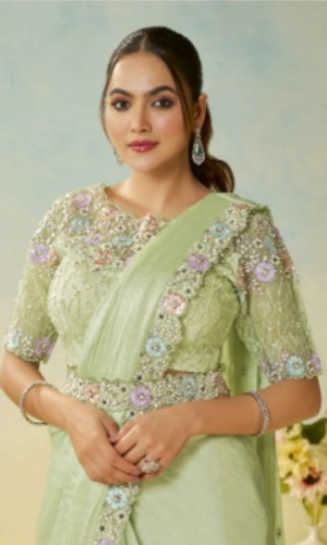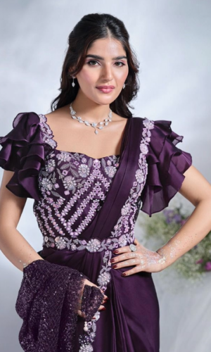 GY $18,000.00Exude timeless charm in this premium Viscose Dola top paired with stylishly draped Santoon dhooti pants for a modern ethnic silhouette. The look is elevated by a delicate net shawl…