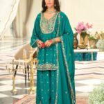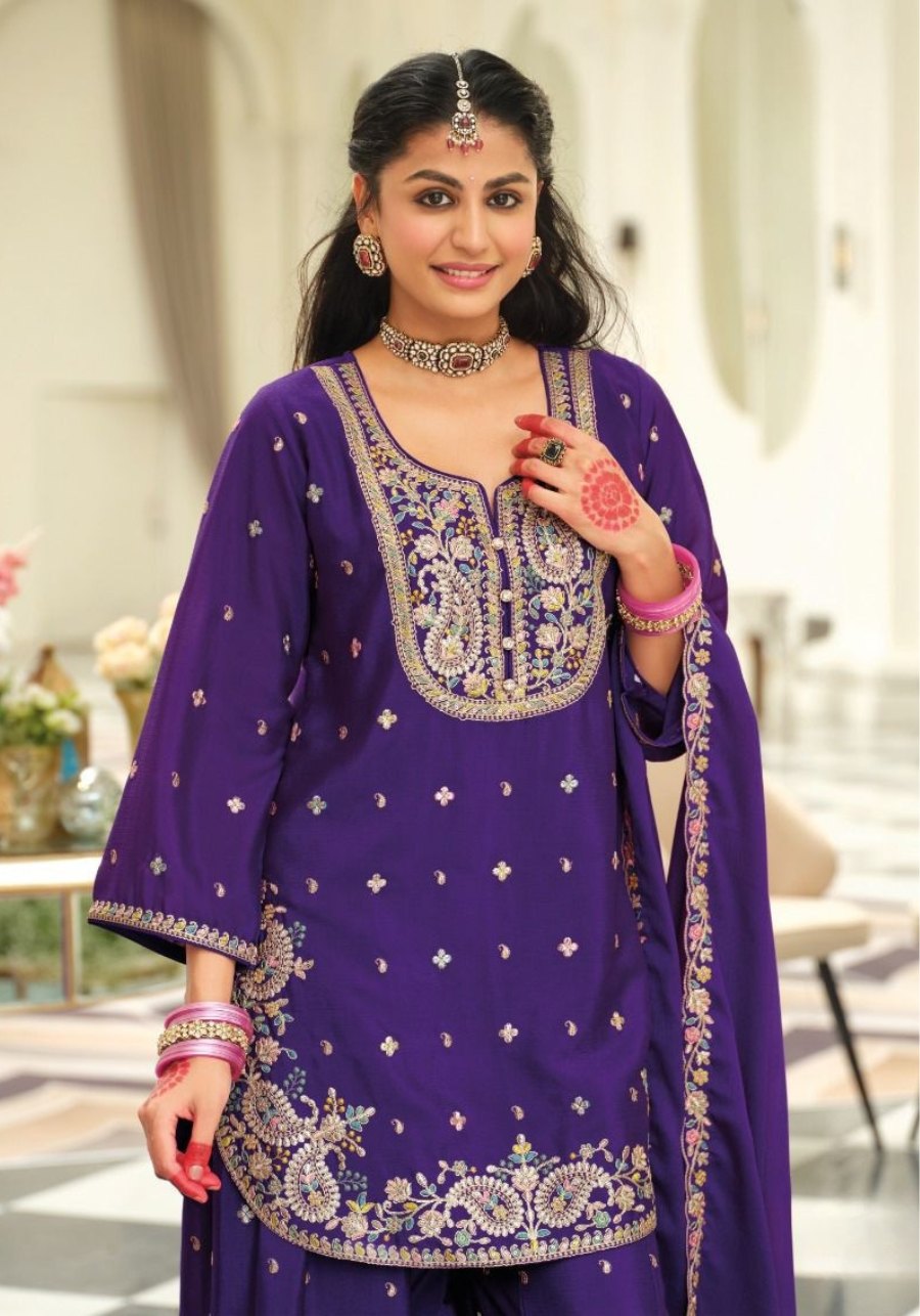 Indulge in the luxurious feel of heavy chinon with this exquisitely crafted three-piece set. The top features intricate embroidery work that highlights the fabric’s natural radiance. It is paired with flowing chinon palazzo pants and a matching embroidered shawl to complete the coordinated look.