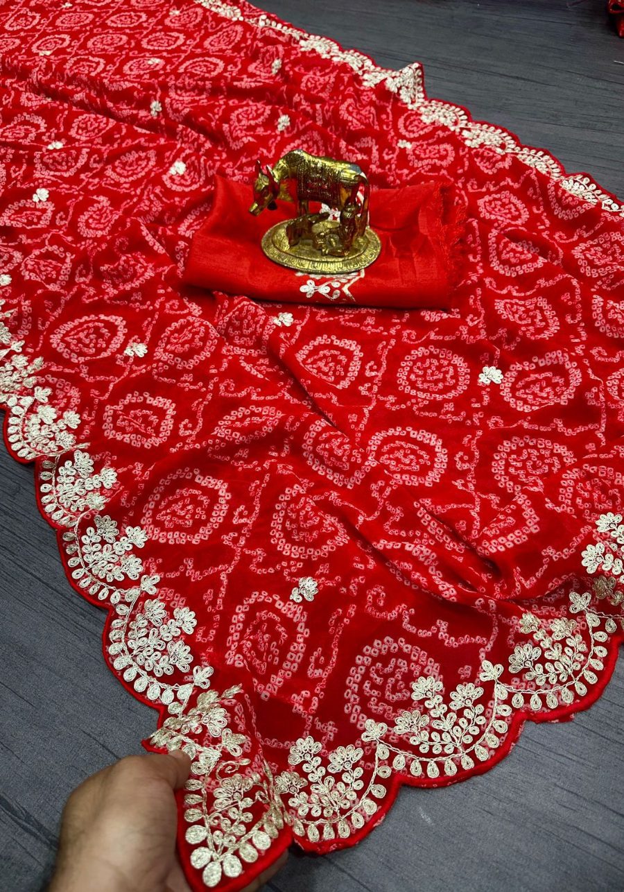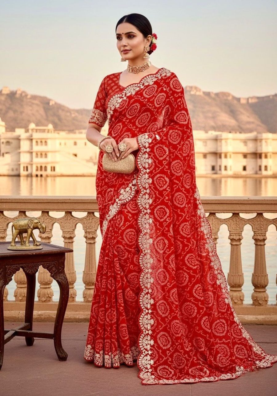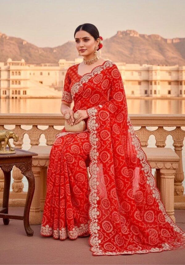Embrace timeless grace with this Pure Georgette Jodhpur Bandhani saree, featuring floral prints and opulent Pita-work. This traditional Rajasthani masterpiece is elevated by modern sequence details and a matching Raw Silk blouse.