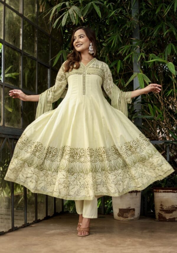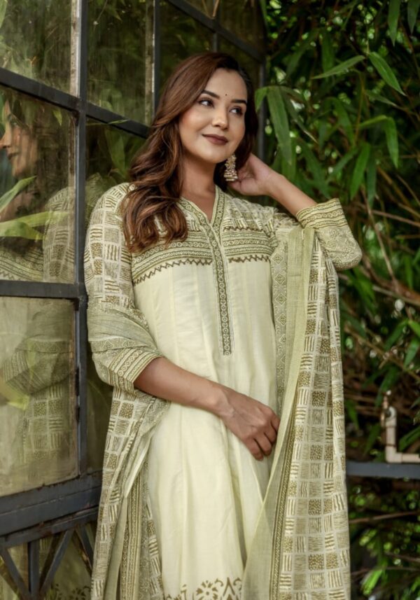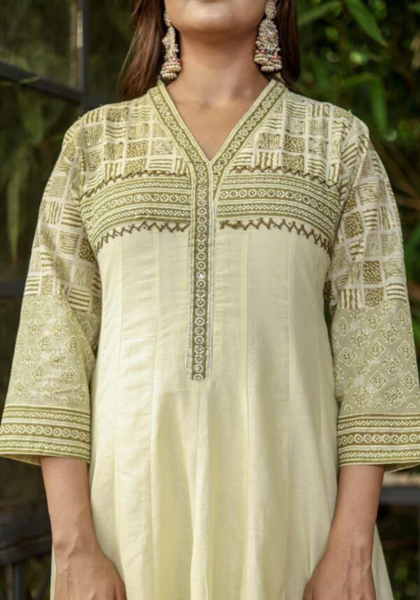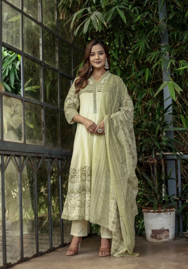 This delicate sage green set features the intricate charm of Kaantha stitchwork on skin-friendly, breathable soft Mul cotton.