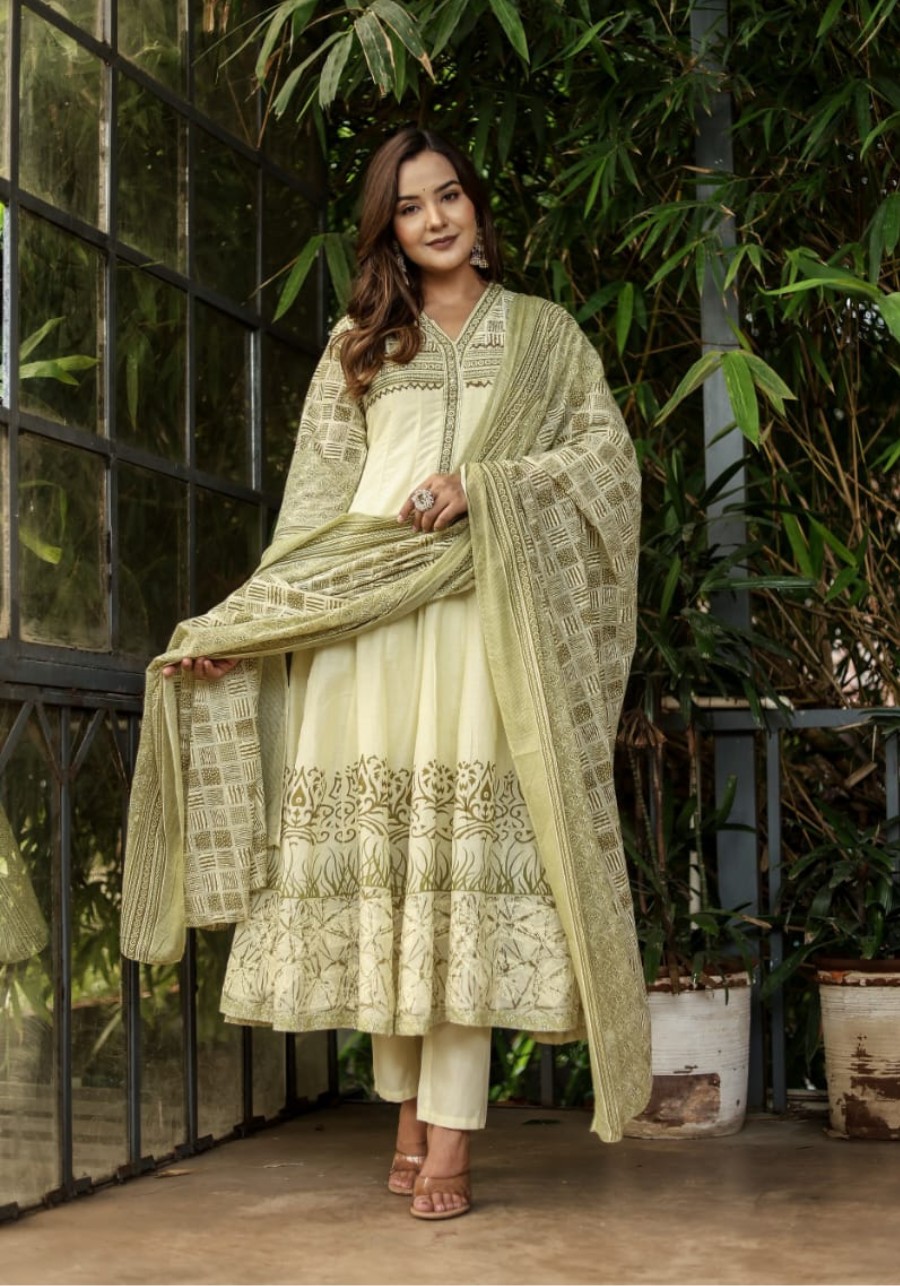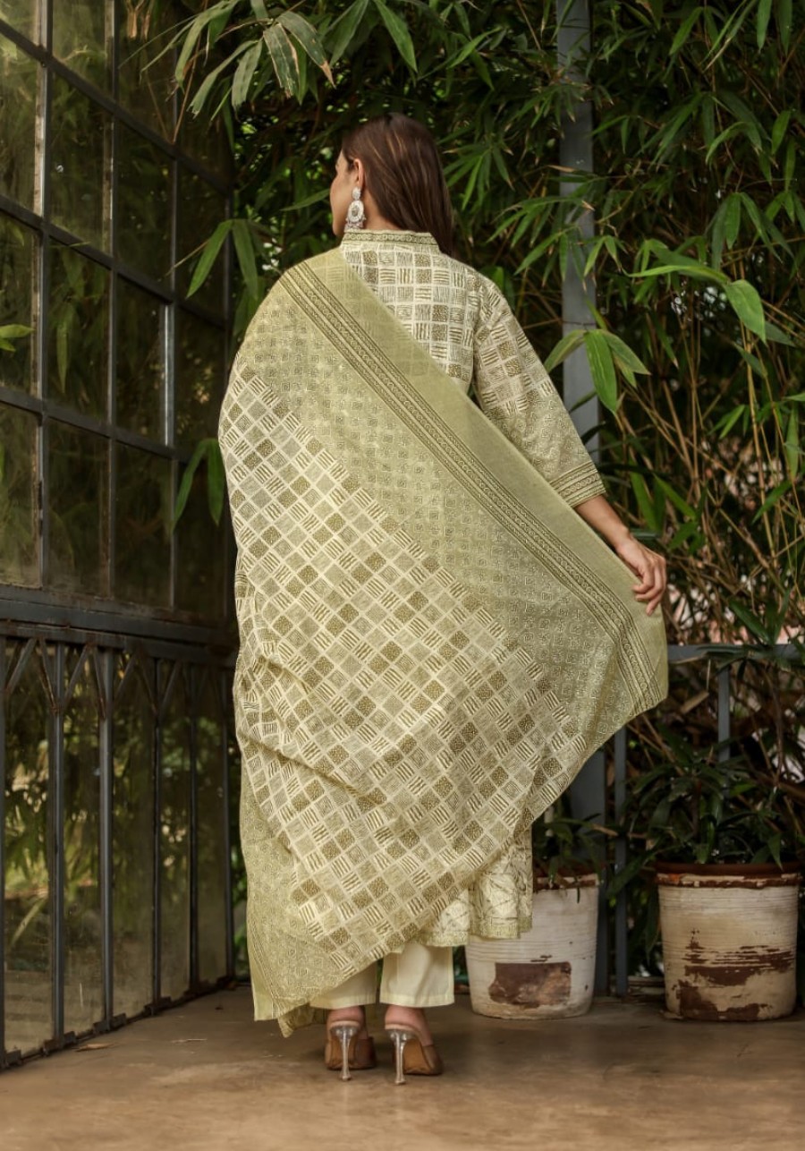 This delicate sage green set features the intricate charm of Kaantha stitchwork on skin-friendly, breathable soft Mul cotton.