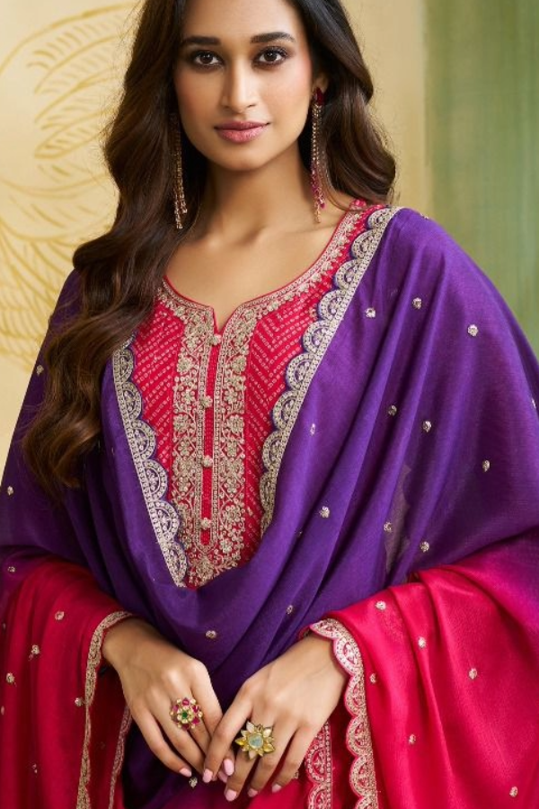 Fine and breathable Chinon Silk with a soft feel and rich look, adorned with hand tied bandhani and hand done embroidery for a Royal look …