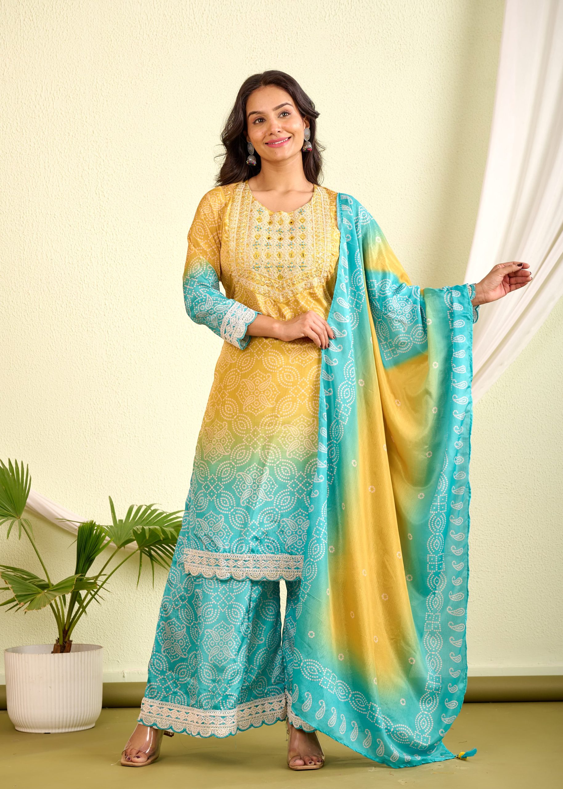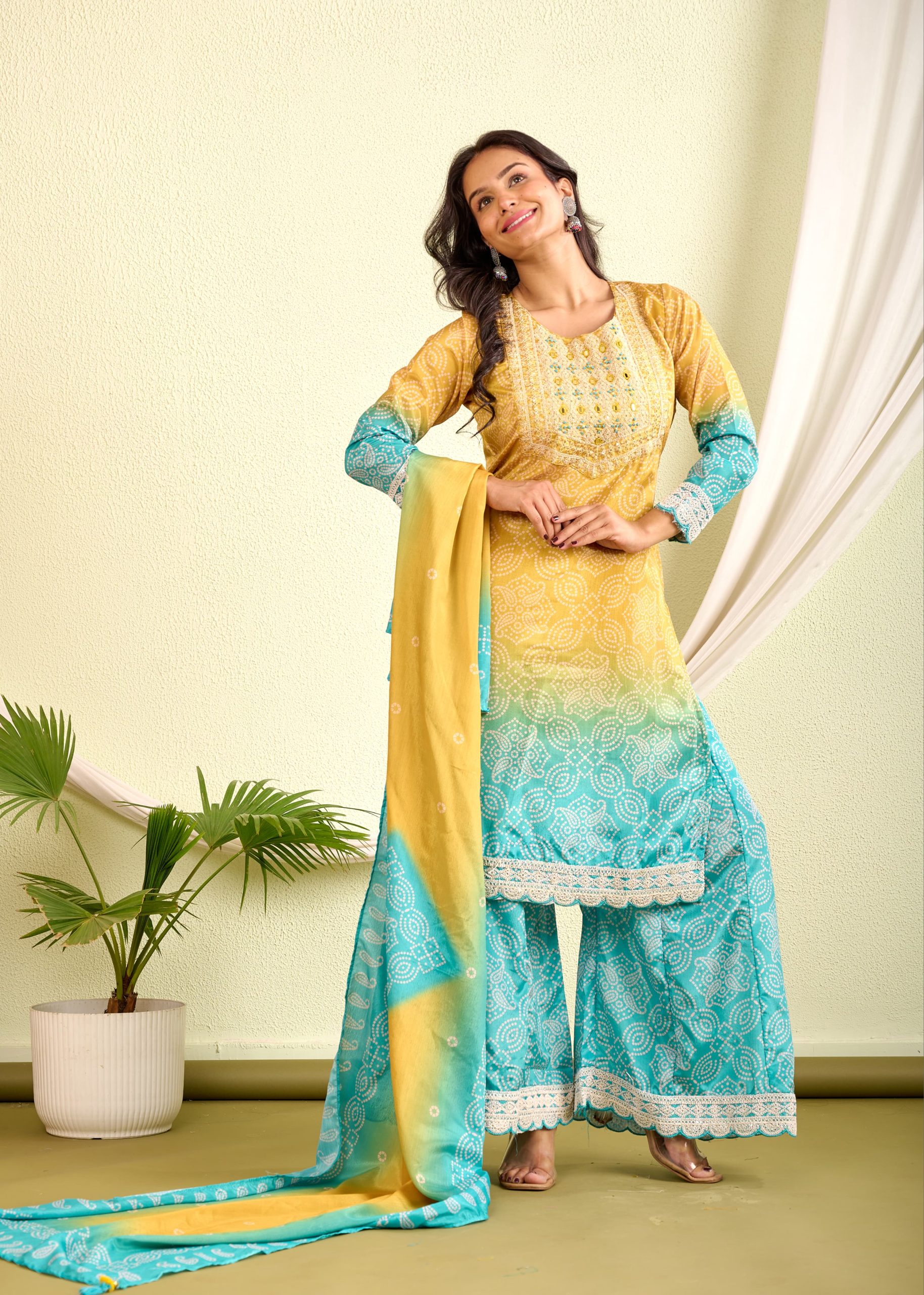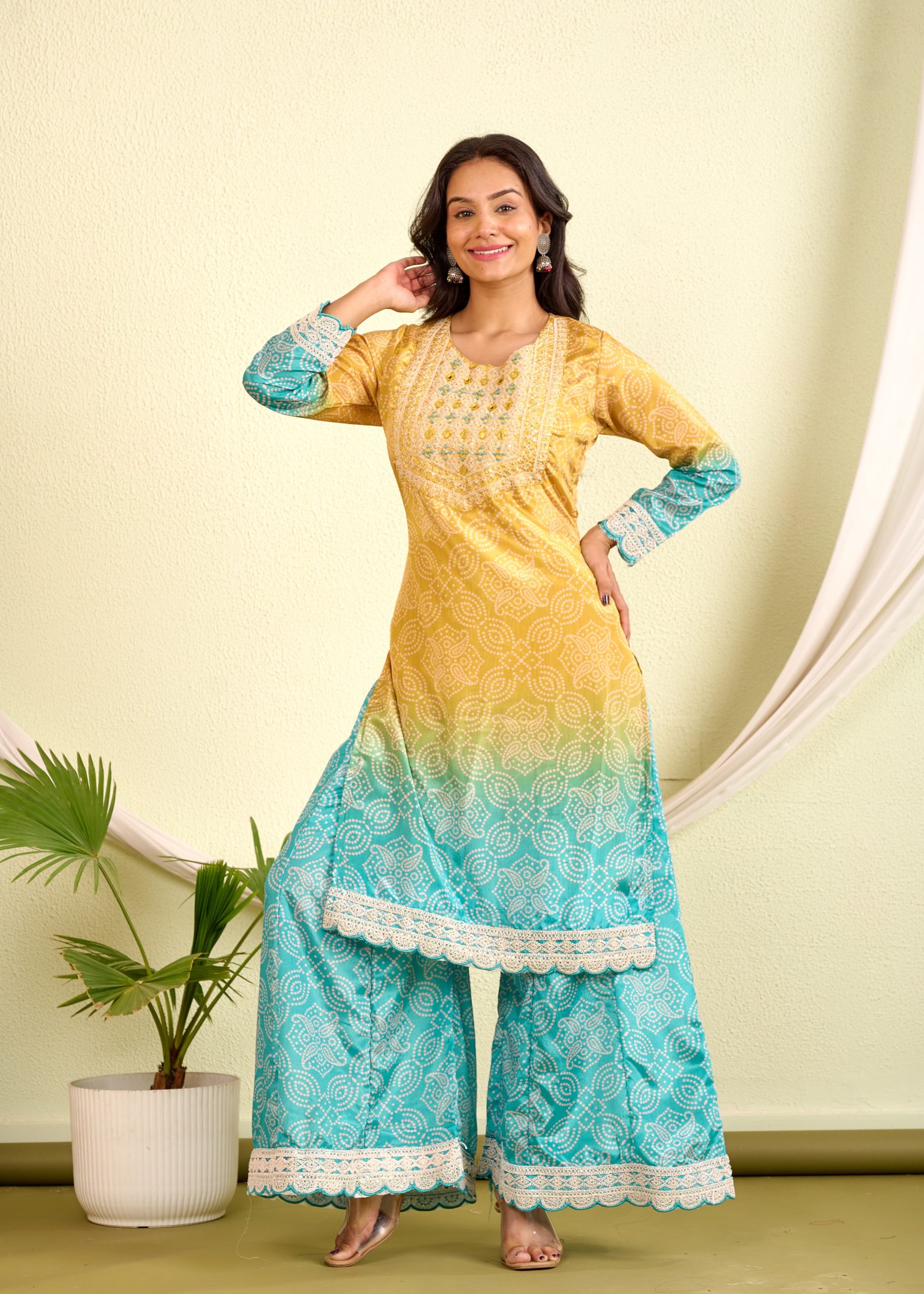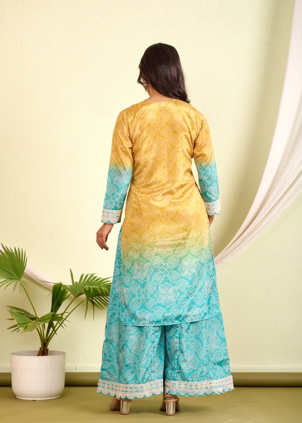 Choose unique style with this comfy bandhani style palazzo set