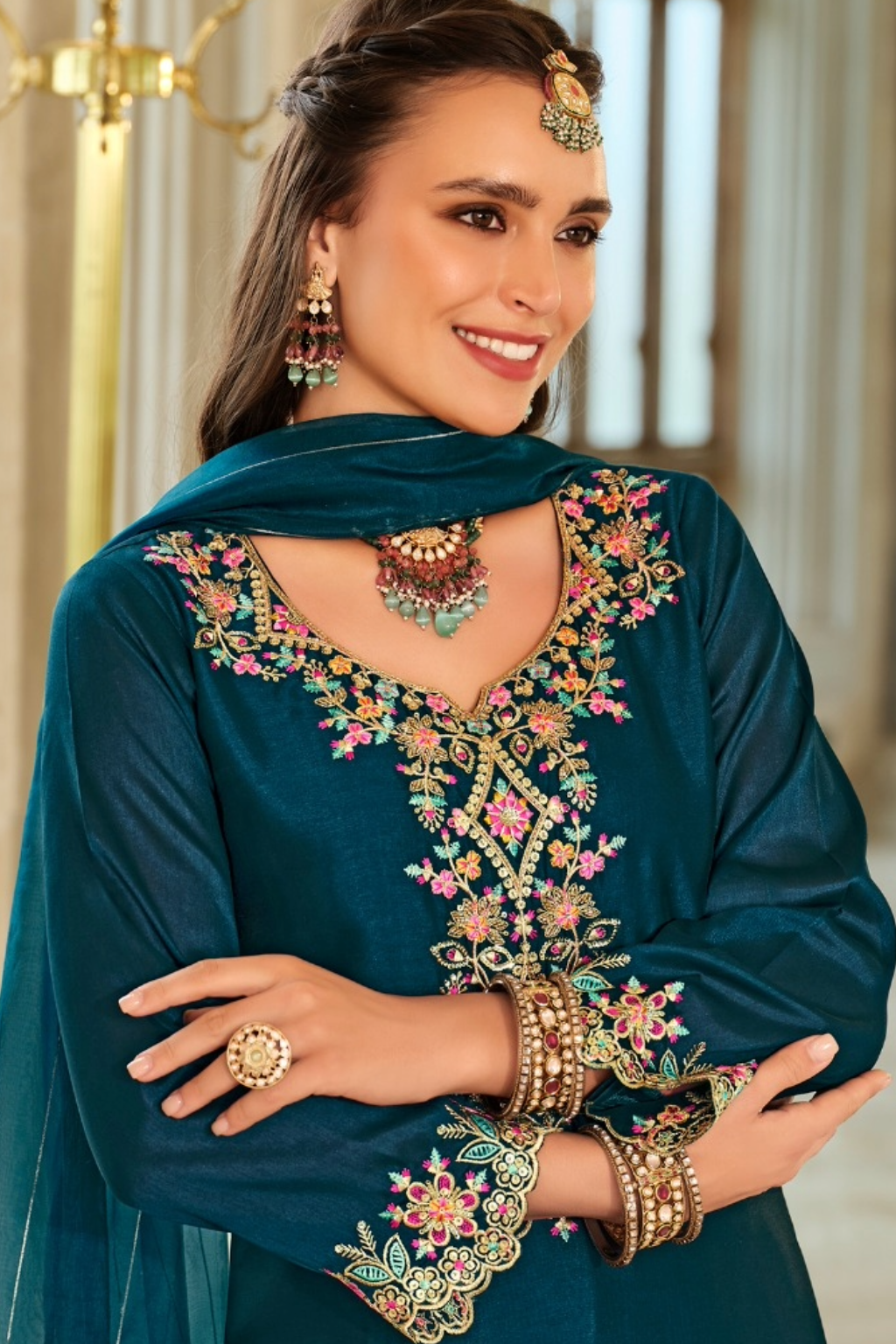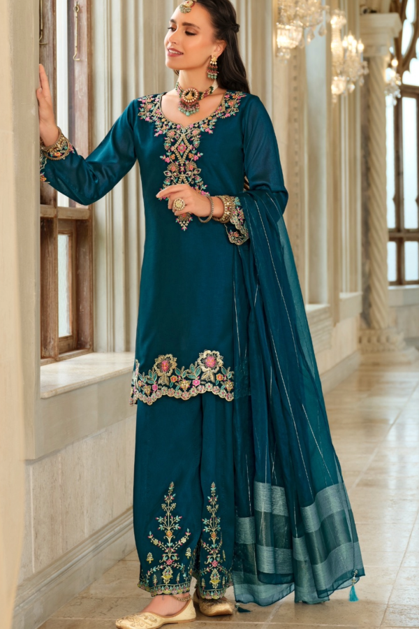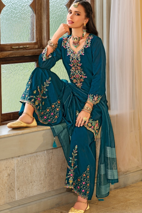 Soft silk piece adorned with high quality hand embroidery and flawless palazzo pants…