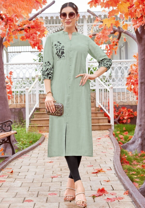 This top is crafted from premium heavy rayon fabric, offering a comfortable fit and a soft feel. It features detailed thread work that adds a touch of traditional elegance to a modern silhouette. Versatile and easy to style, it is suitable for both casual outings and festive gatherings.