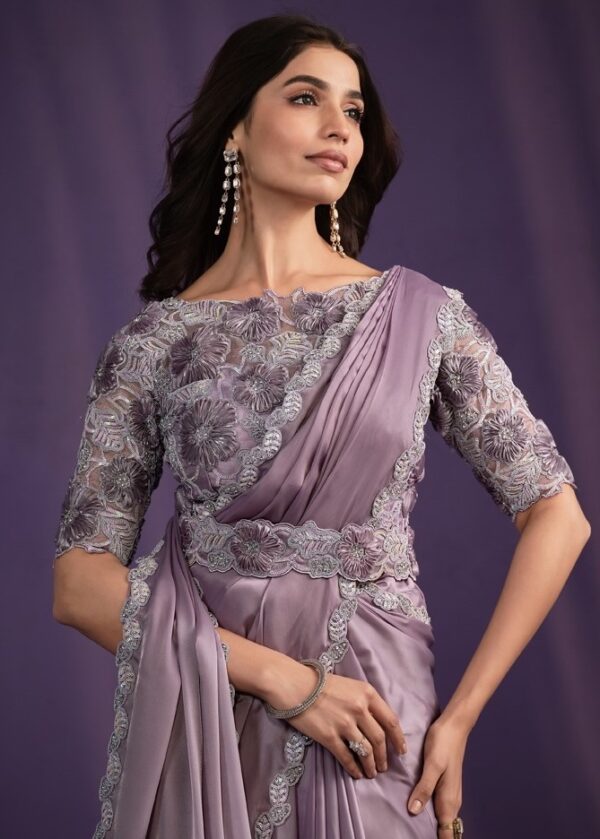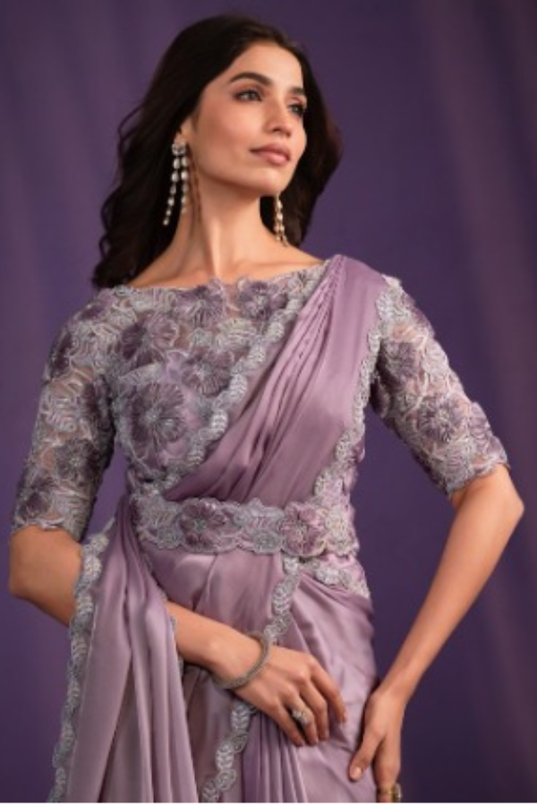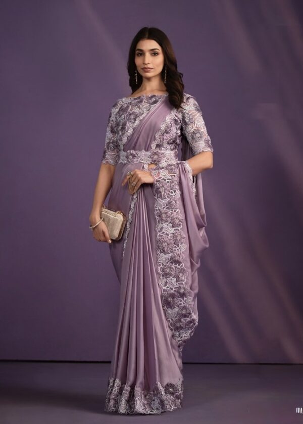 Redefine convenience with this pre-stitched Crepe Satin Silk one-minute saree, paired with a stitched Organza Silk blouse featuring a stunning mix of sequence, cord, thread embroidery, and stone work.