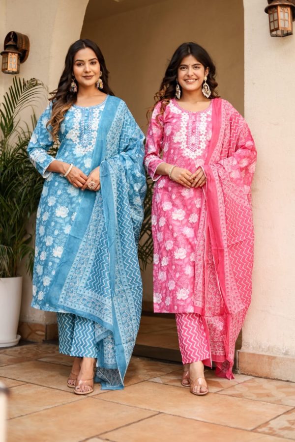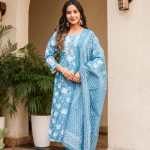 Glam up with premium pure cotton made set with hand block prints and intricate embroidery along the neckline…