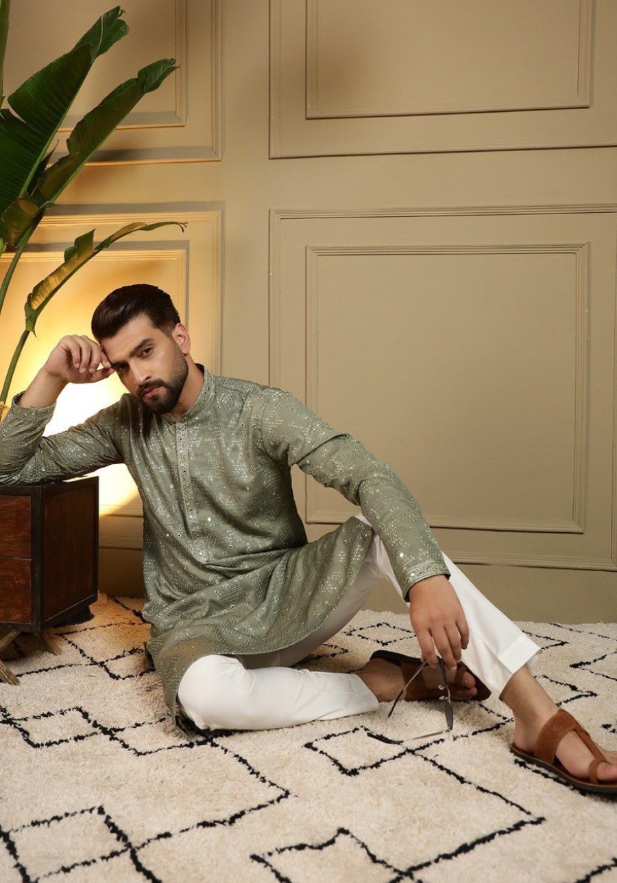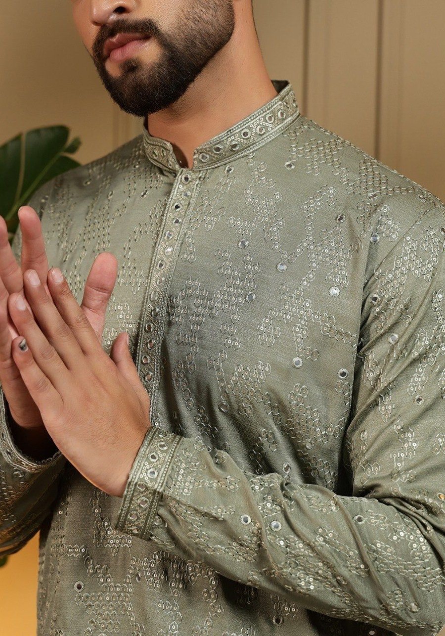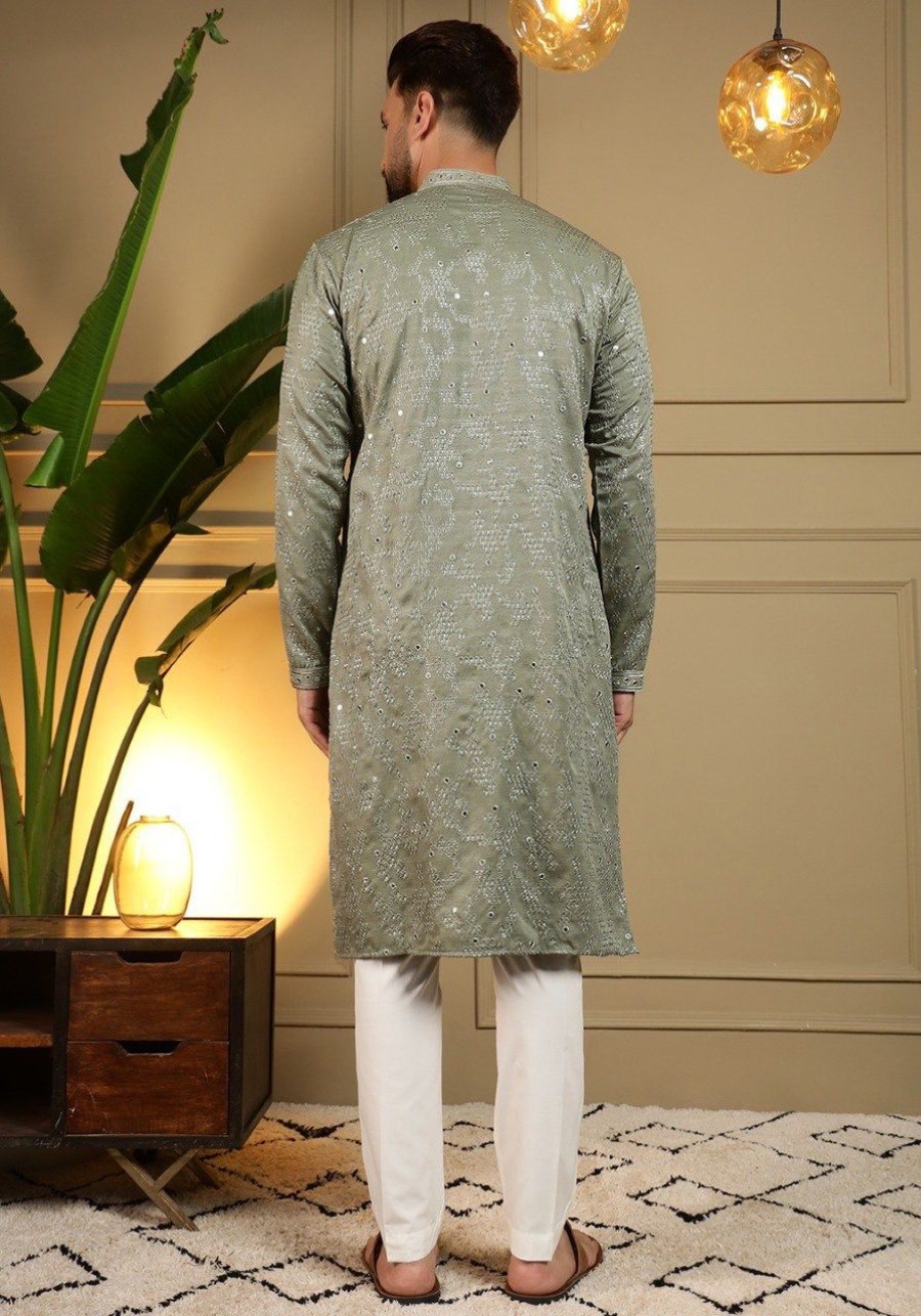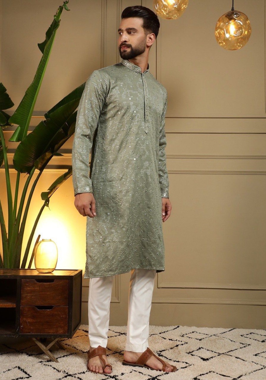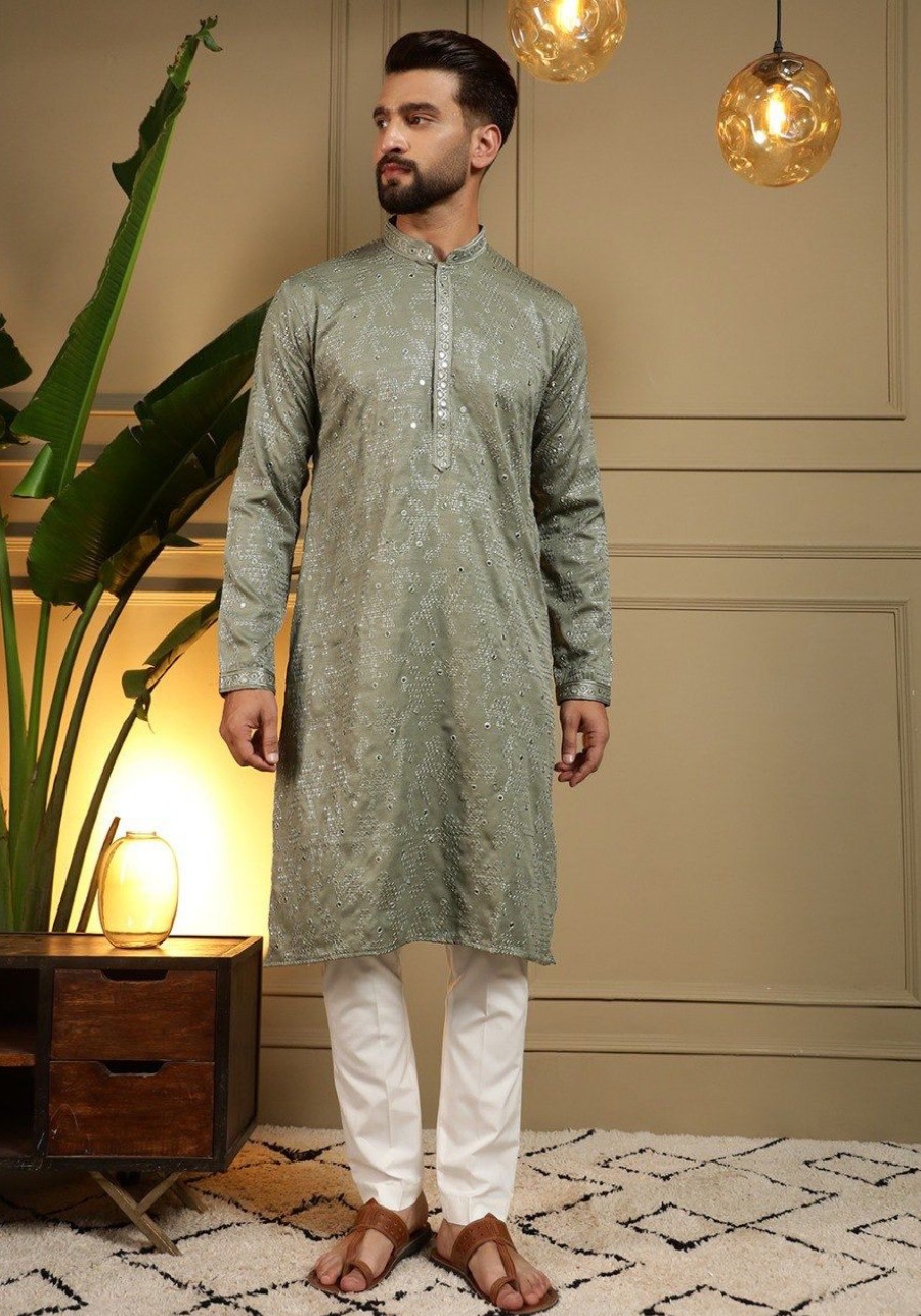 Luxurious Embroidered Kurta Pajama for Men in Cascade Green