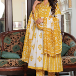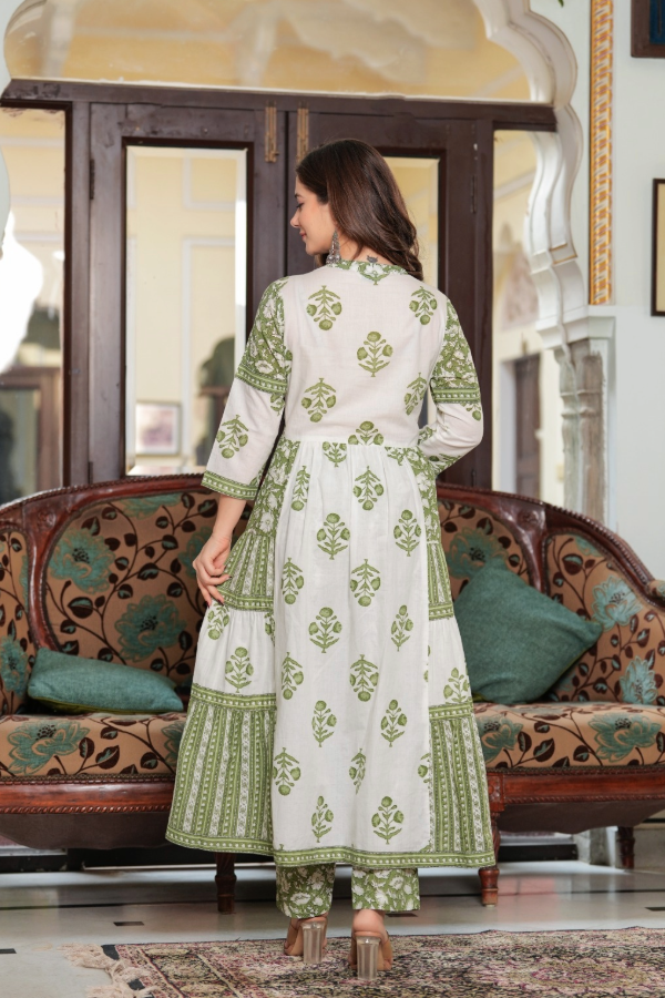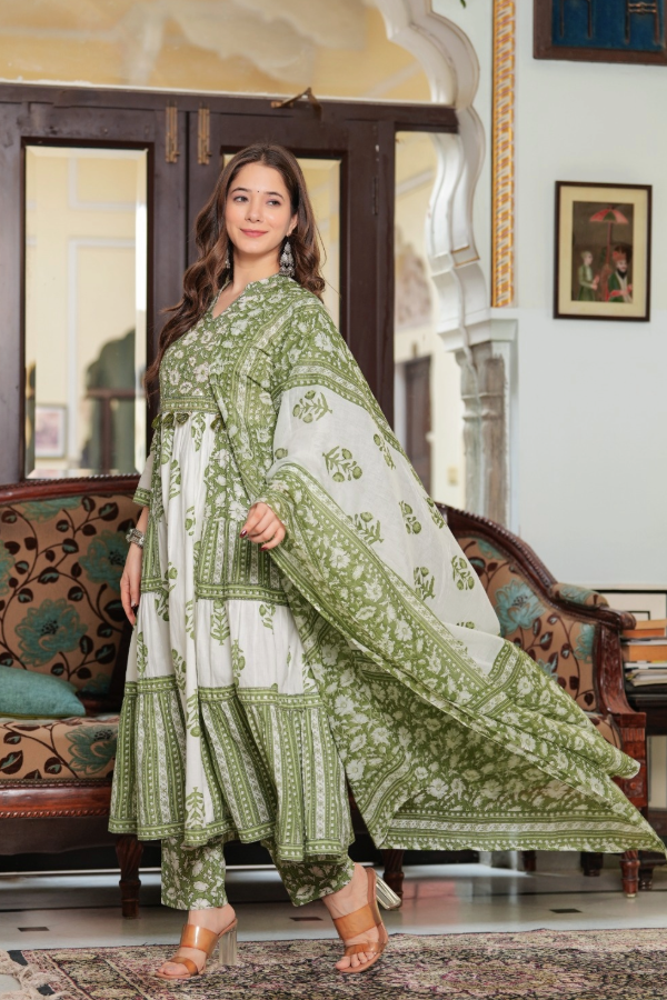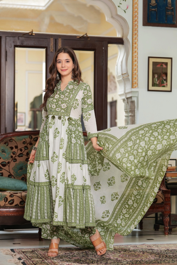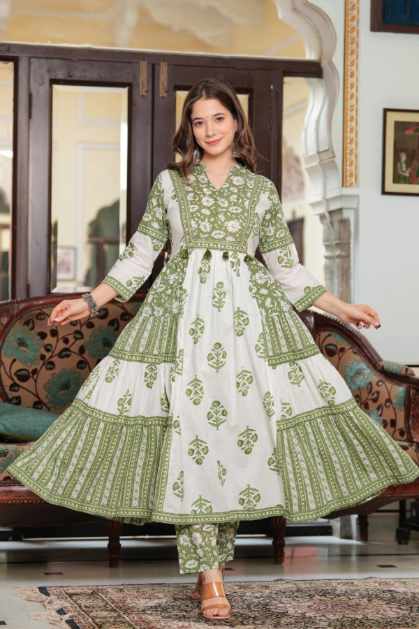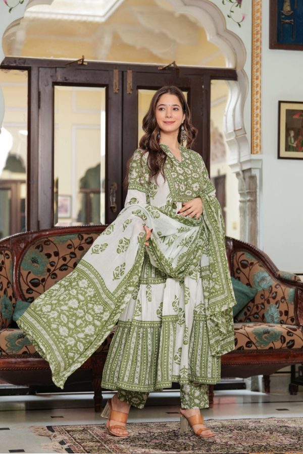 Full flare Anarkali in classy soft cotton, entirely adorned with elegant hand block printing.