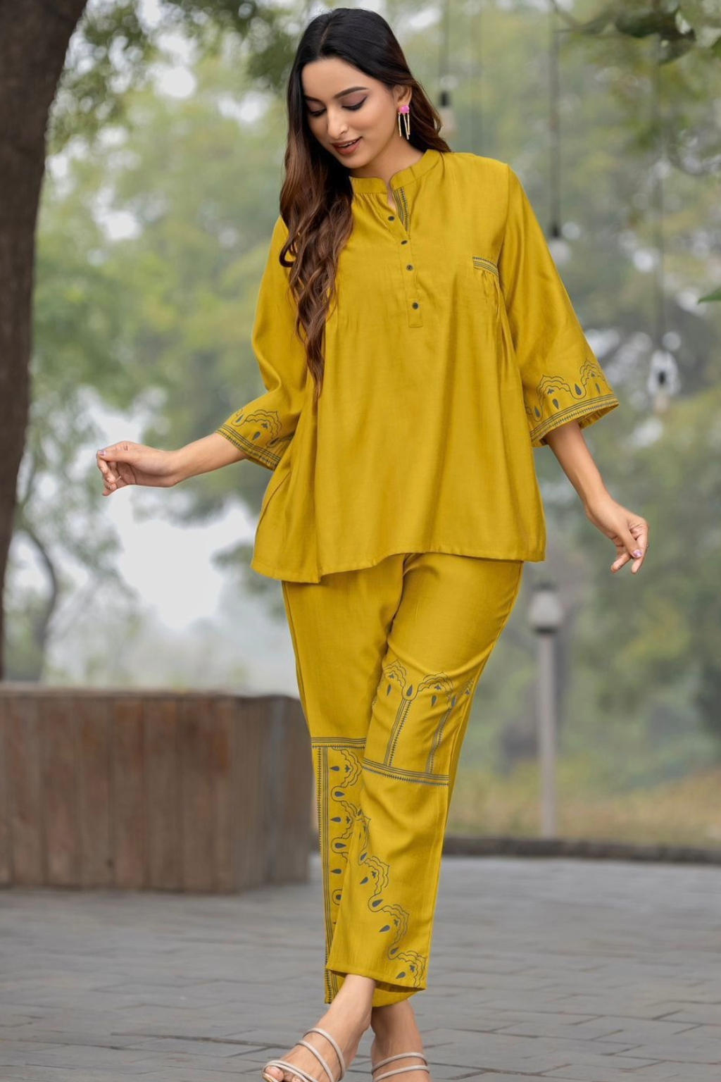Get glowing in cotton blend fabric coord set with catchy patterns and classy stitch