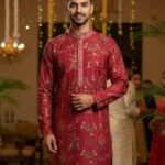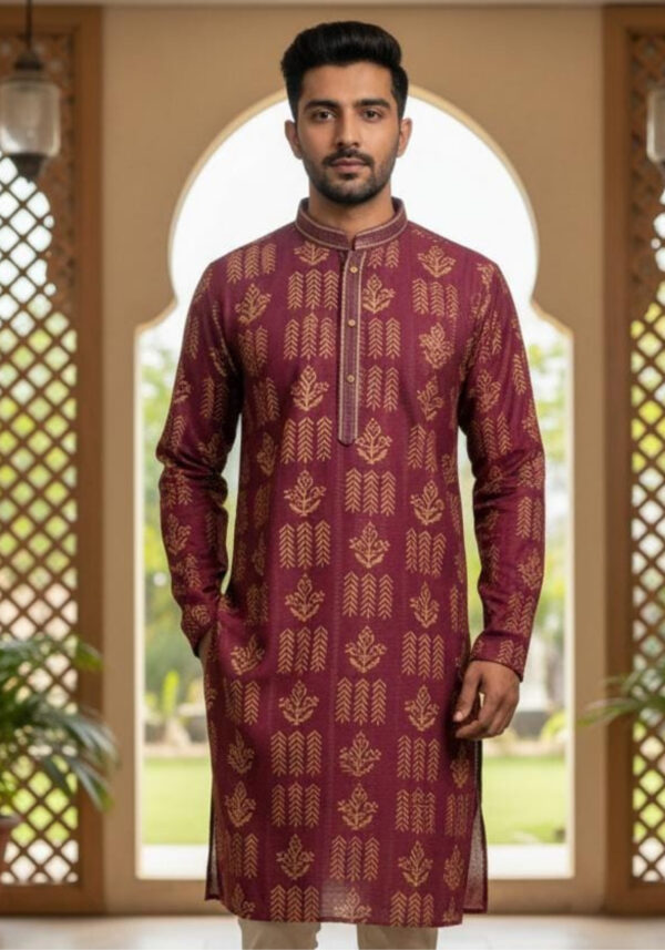 Tailored from high-quality Art Silk with sophisticated prints and detailed Pintex work, this kurta features a refined, three-dimensional look for weddings and festivals. The set includes a breathable Cotton pajama for comfort, designed with full sleeves and functional pockets on both sides for maximum practicality.