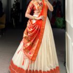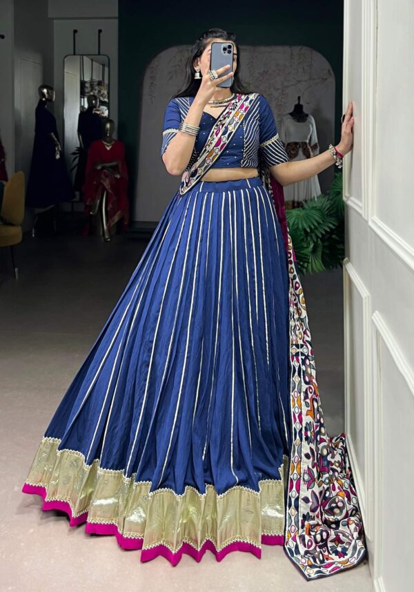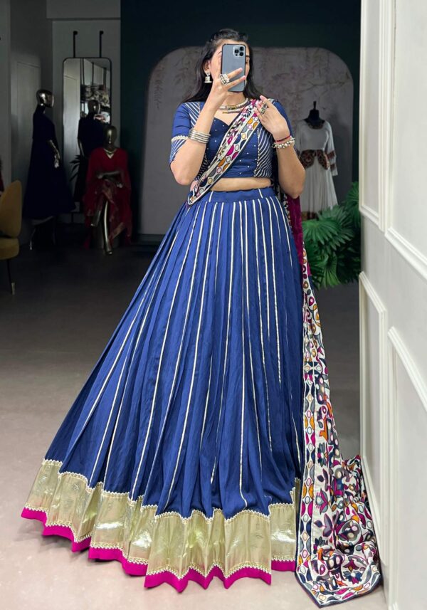 Experience festive elegance in this pure Chanderi lehenga set. Both the lehenga and blouse feature intricate zari weaving work complemented by embossed design lace details. This ensemble offers a radiant glow and a soft, comfortable feel, making it a perfect choice for traditional celebrations.
