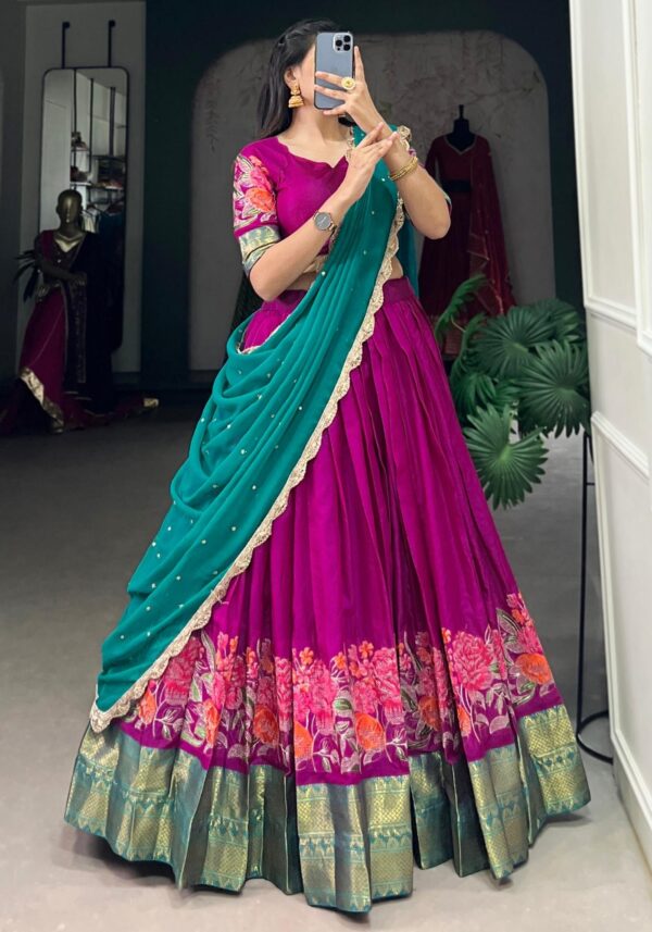Elegant Cotton Silk Lehenga featuring intricate thread embroidery and rich Zari weaving. This luxury set pairs a detailed blouse with a soft, fluid Georgette shawl for a flawless drape. Lightweight, traditional, and perfect for weddings or festive celebrations.