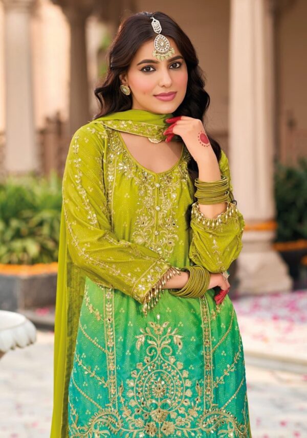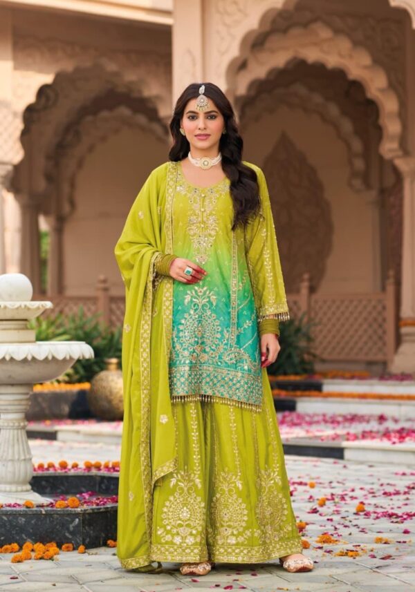 Elevate your festive wardrobe with this heavy Chinon set, featuring a stunning digital print top and a matching embroidered dupatta. The highlight is the statement palazzo, designed with intricate embroidery on both the front and back for a truly stunning look from every angle.