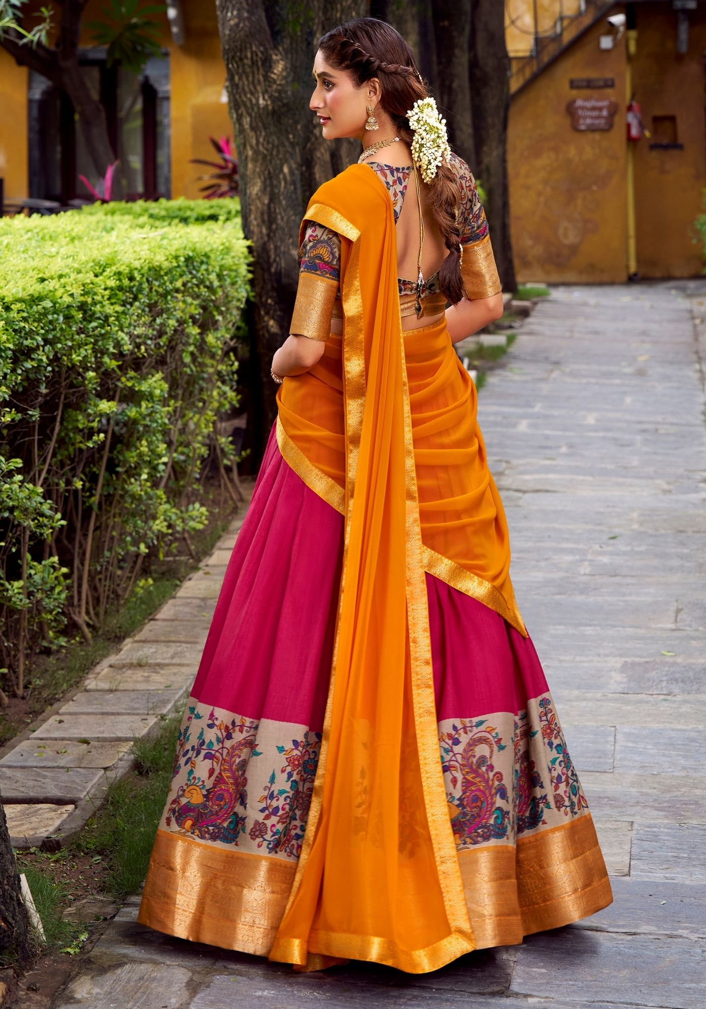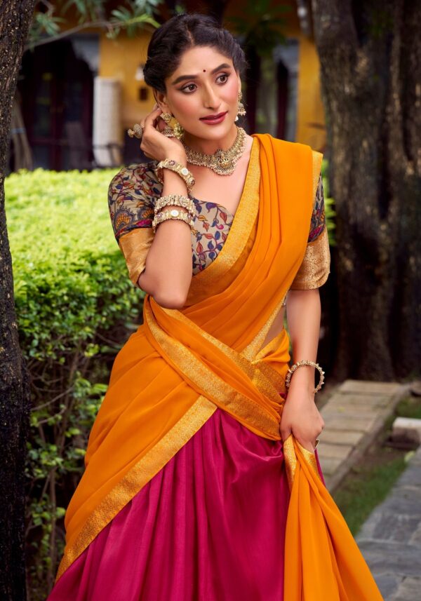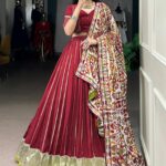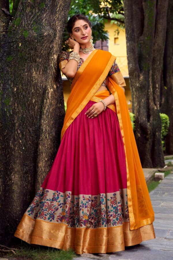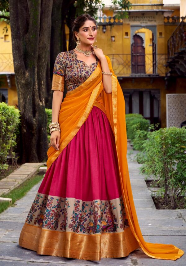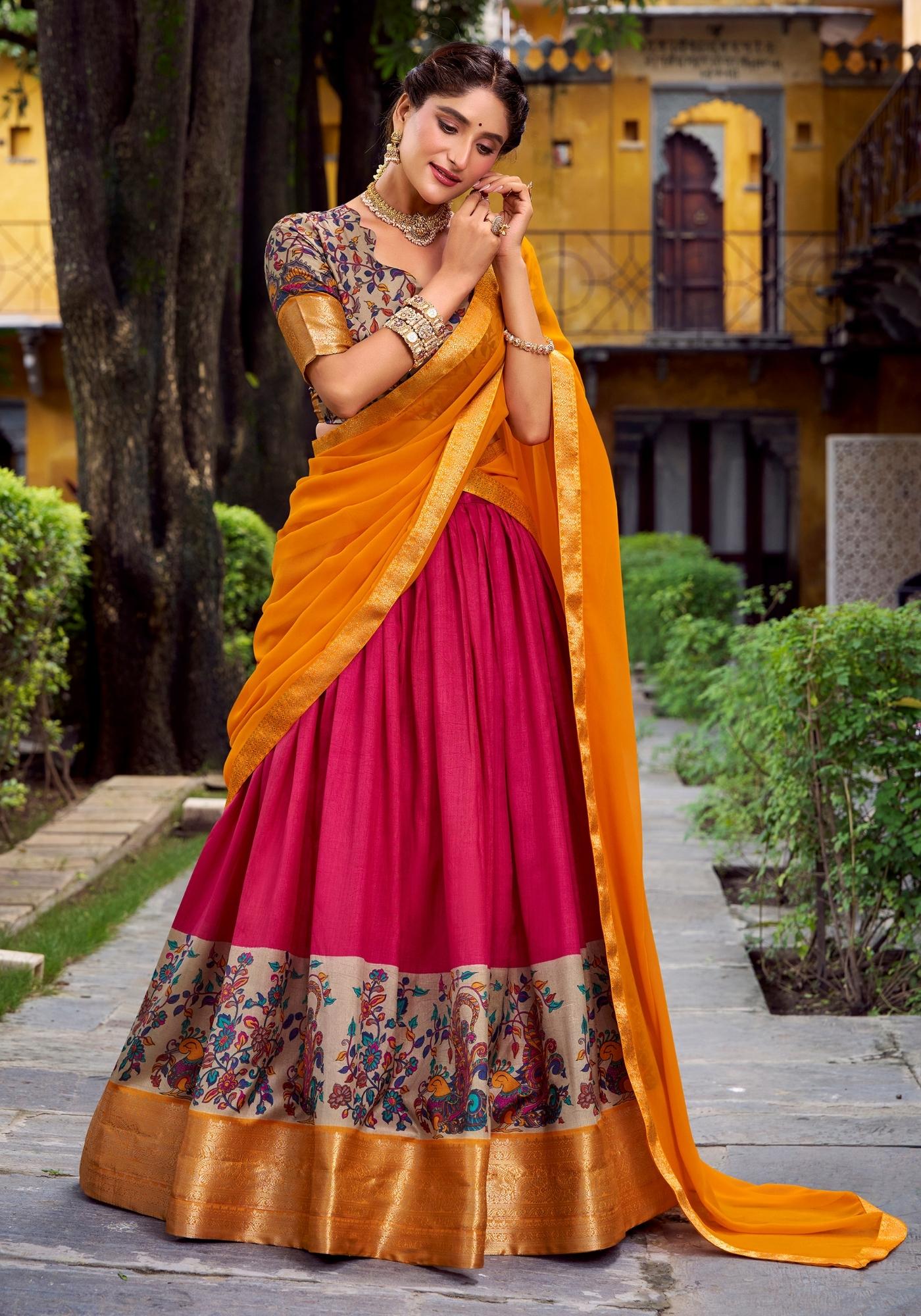 Make your festive moments unforgettable with this bold silk lehenga and matching blouse featuring exquisite zari-weaving and prints, perfectly finished with a Georgette dupatta and ornate lace borders.
