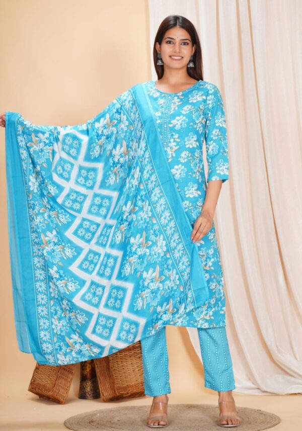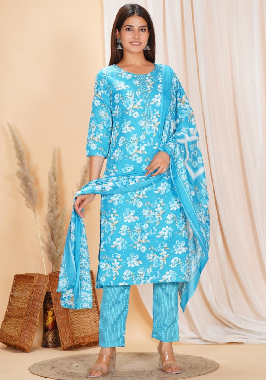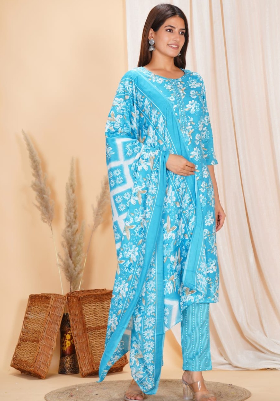This vibrant Firozee blue ensemble is masterfully crafted from premium flex cotton, featuring traditional hand-block prints.