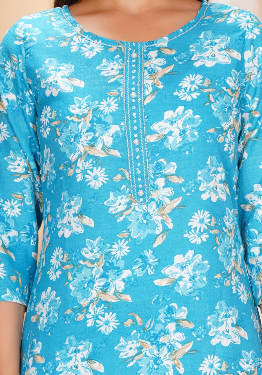 Firozee Blue Flex Cotton Ensemble With Hand-Pearl & Stone Detailing