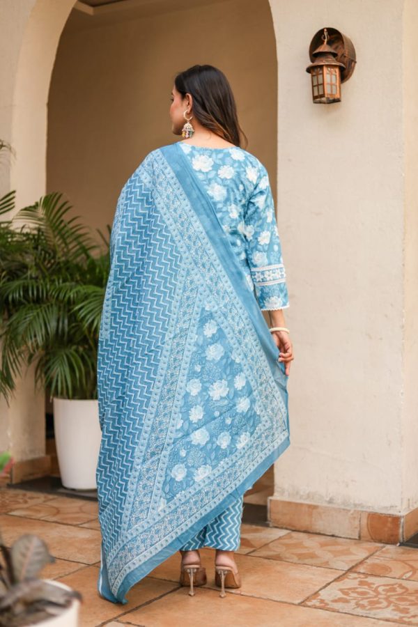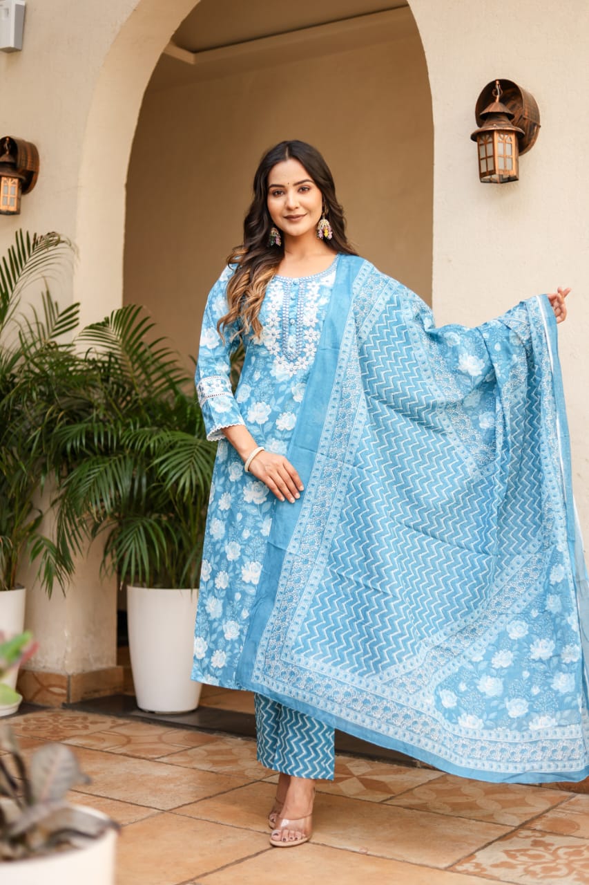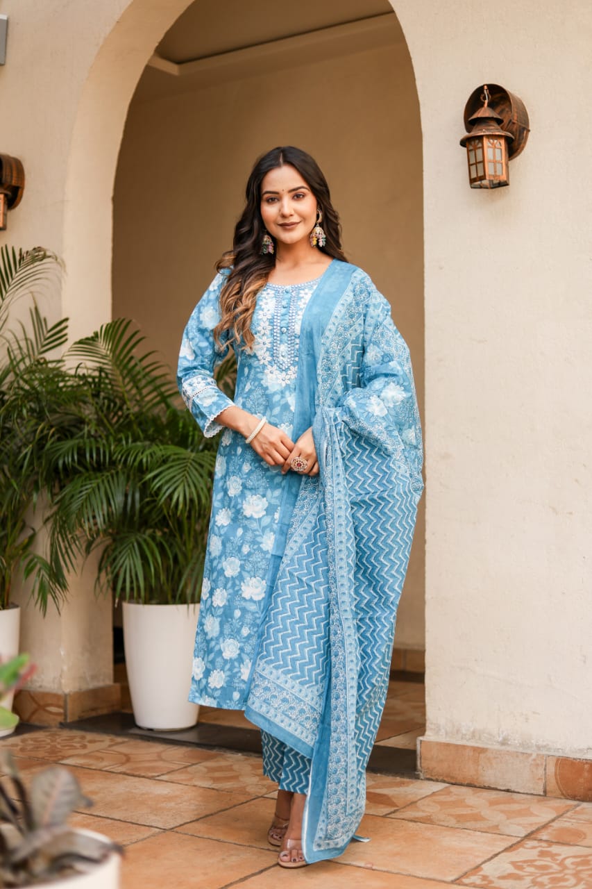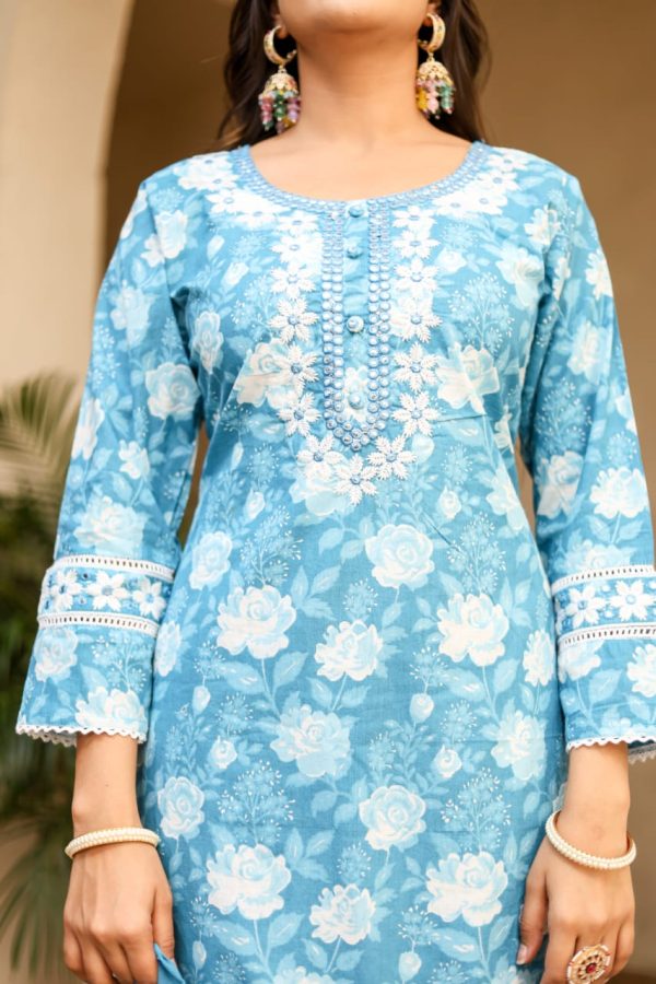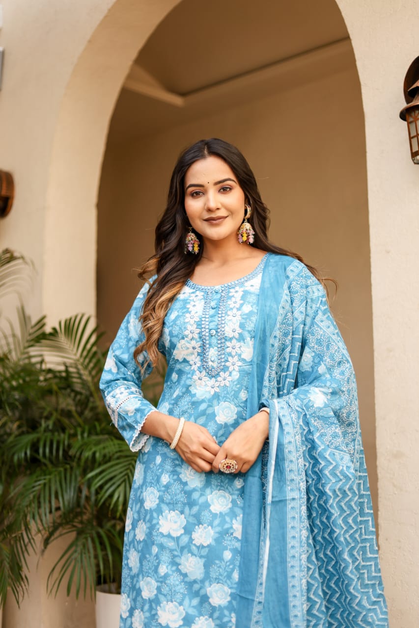 Glam up with premium pure cotton made set with hand block prints and intricate embroidery along the neckline…