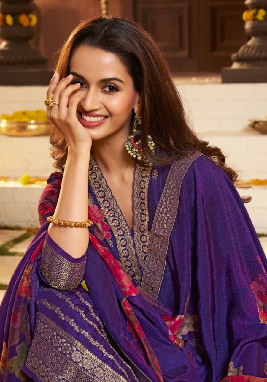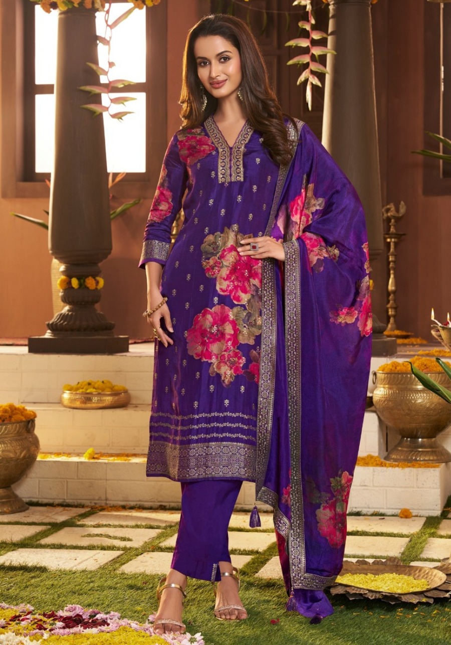 This sophisticated deep purple silk suit features a straight-cut kurti accented with bold pink floral motifs and elegant silver zari borders.