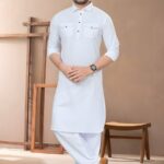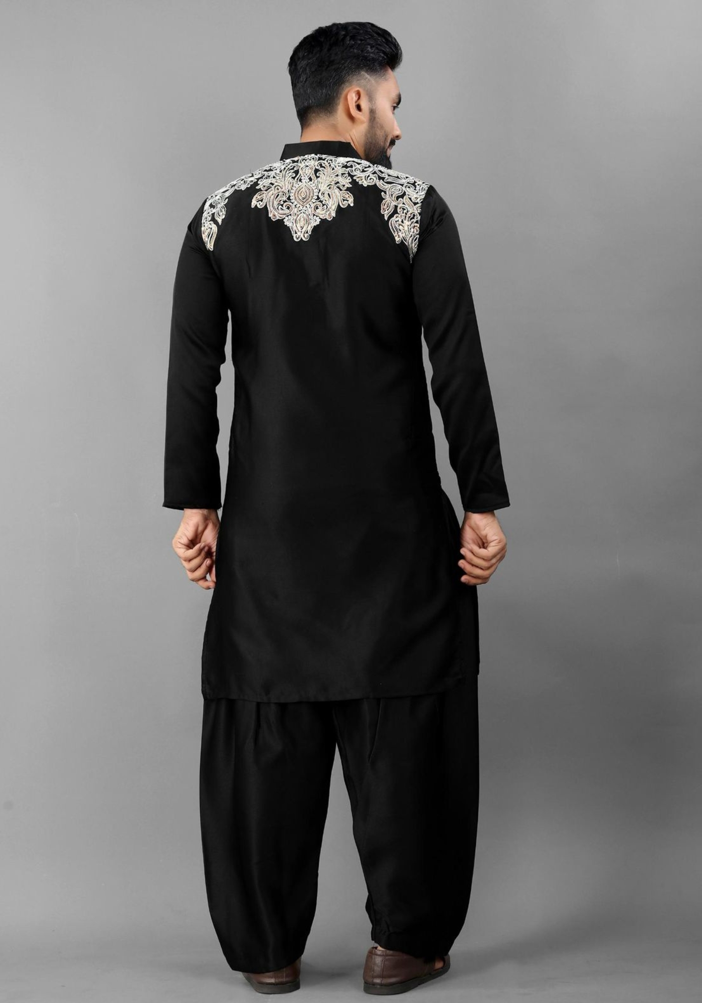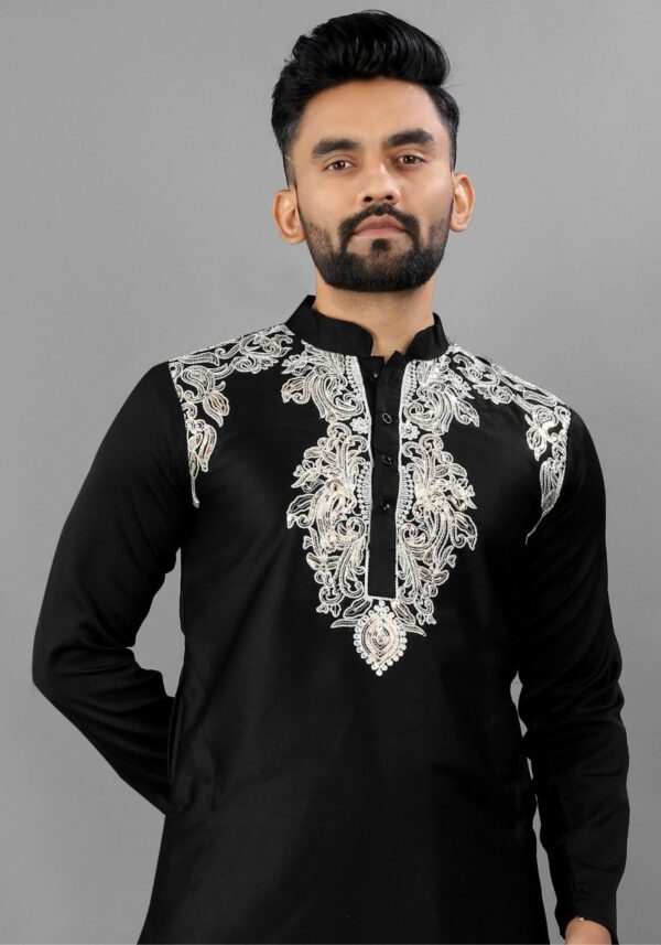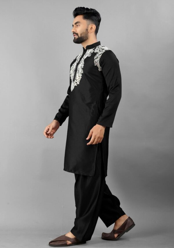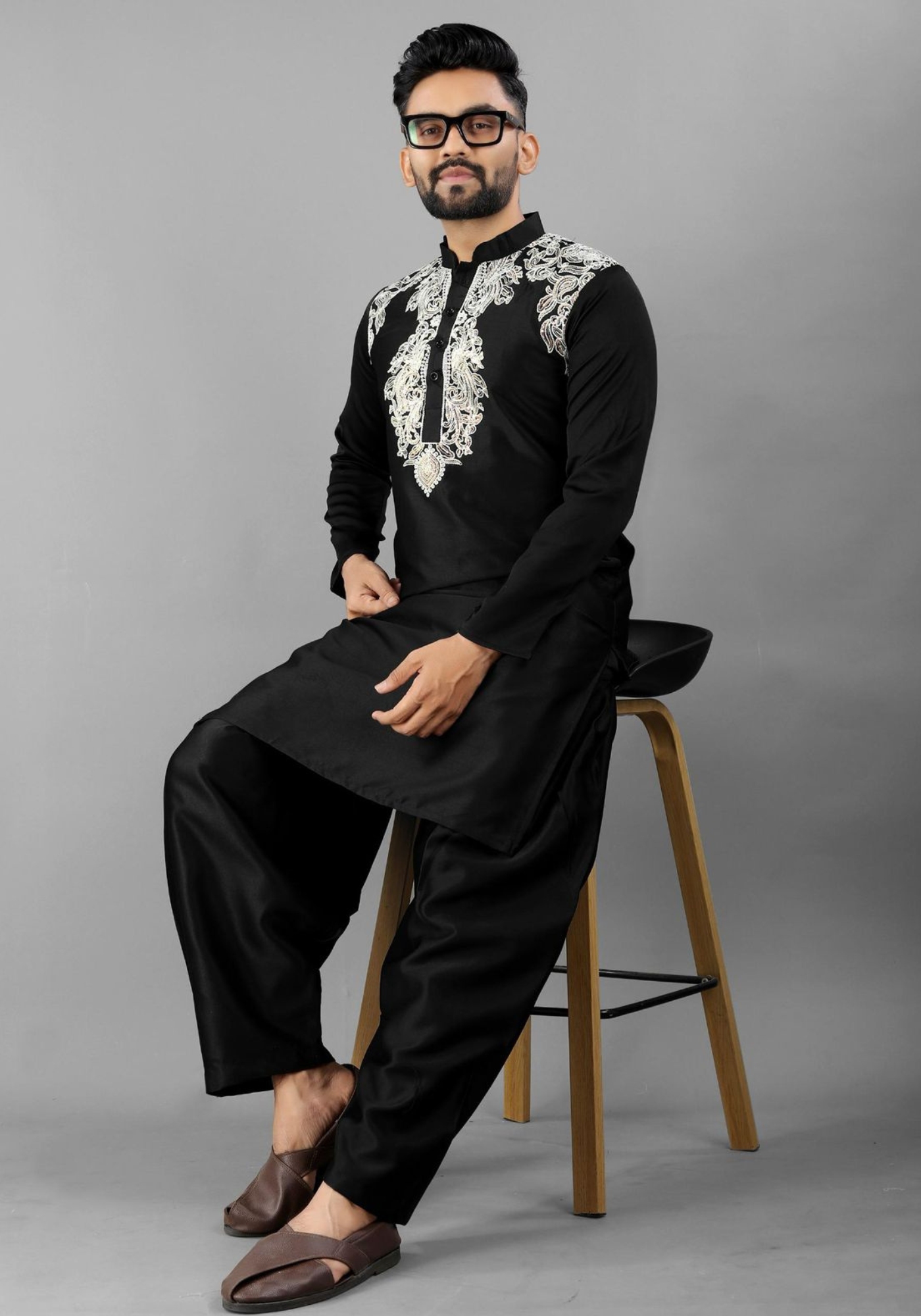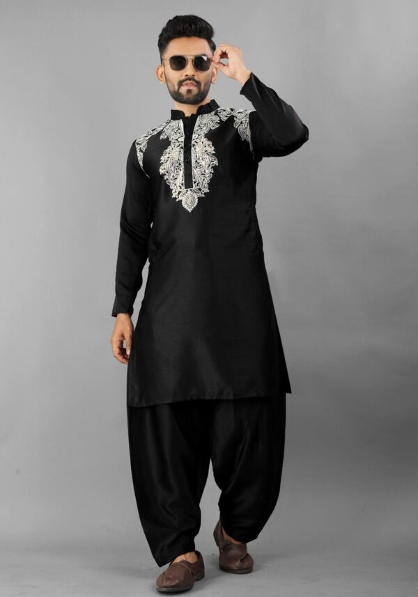 This luxurious satin silk set features heavy front-and-back embroidery, offering a grand aesthetic with a smooth, elegant finish. The coordinating trousers and intricate craftsmanship create a sophisticated silhouette perfect for high-profile celebrations.