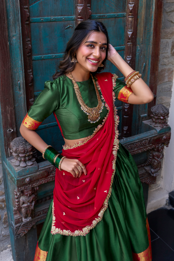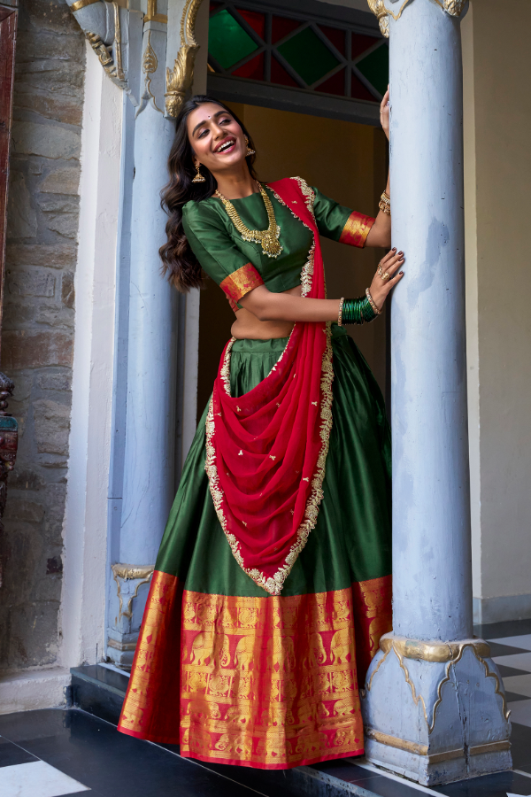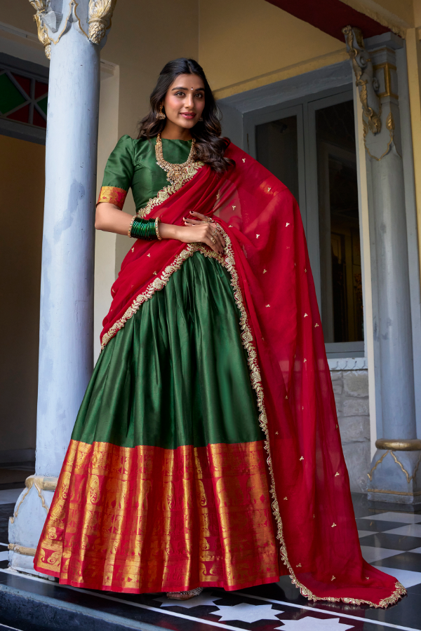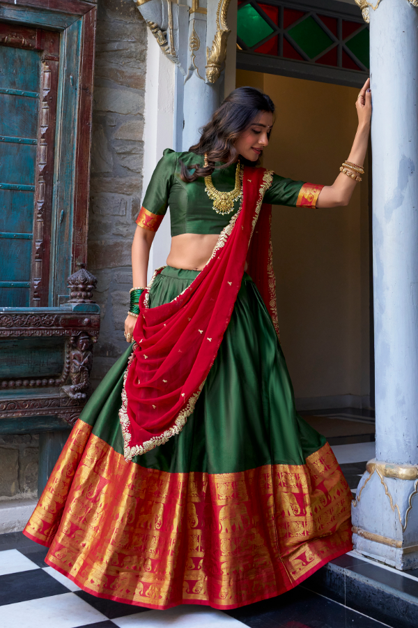 FULLY STITCHED Emerald & Crimson Silk Lehenga With Zari Elephant Border & Wavy Shawl