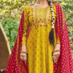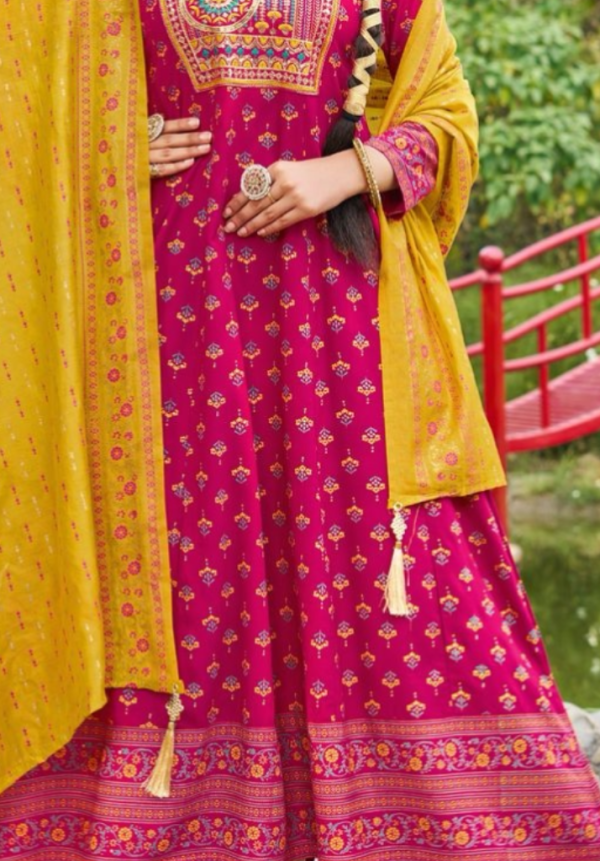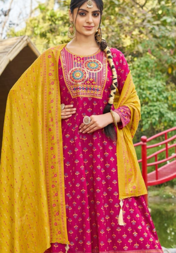 A gorgeous anarkali gown with hold foil prints adorned with hand embroidery, paired with bright contrast dupatta for a gorgeous look!!