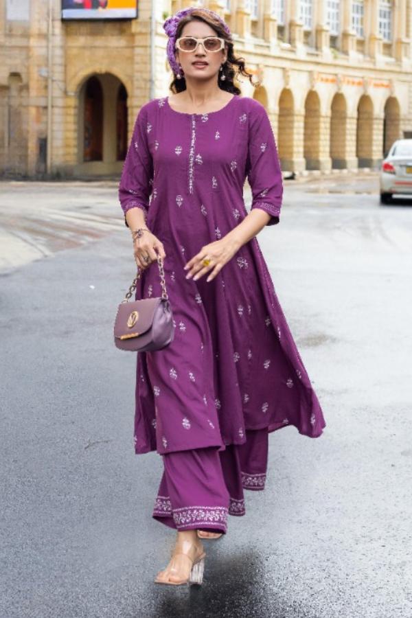 The perfectly fitted kurta pairs seamlessly with a flowy palazzo that strikes the ideal balance—neither too wide nor too narrow.