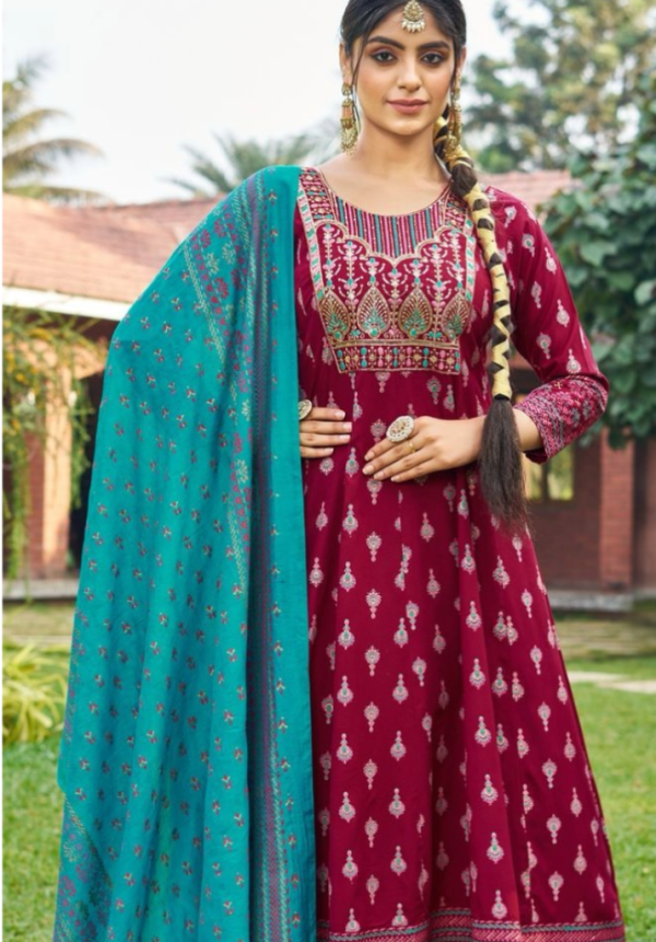 A gorgeous anarkali gown with hold foil prints adorned with hand embroidery, paired with bright contrast dupatta for a gorgeous look!!
