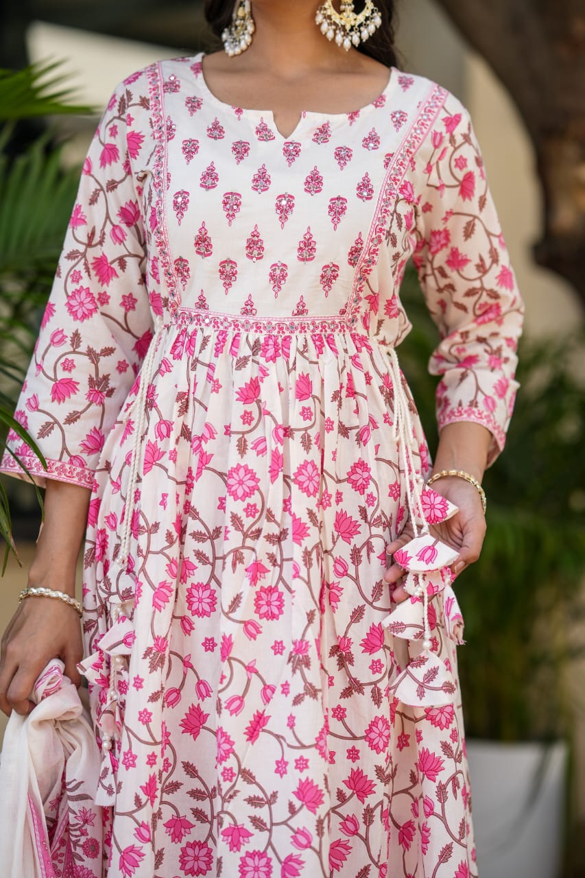 Discover our hand-block printed Anarkali at an unbeatable price. The fabric is pure, non-see-through, and incredibly soft, keeping you cool and comfortable all day. With high-quality stitching, this piece gives you a distinct and elegant look, perfect for any occasion.