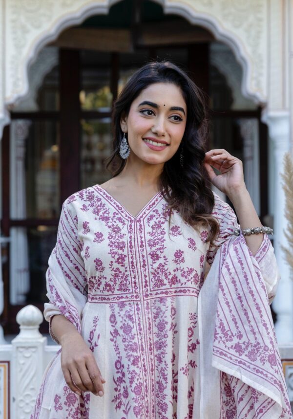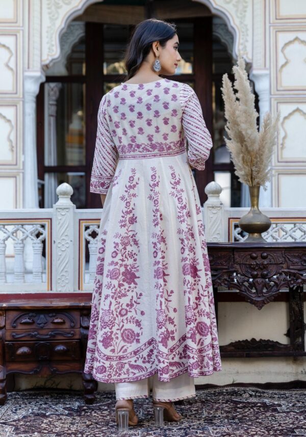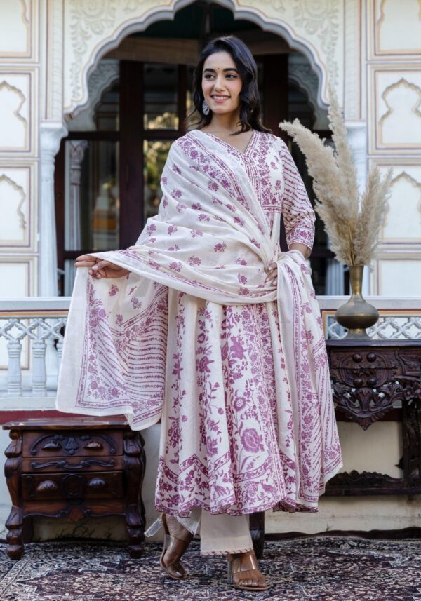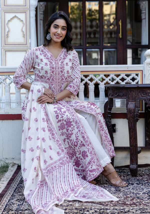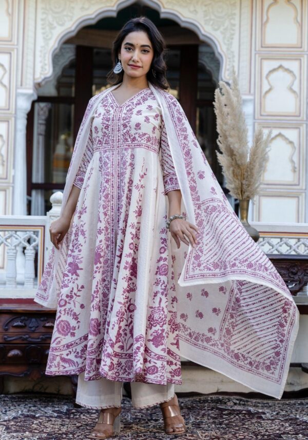 This grand Anarkali is crafted from premium soft dobby cotton, featuring a unique self-textured weave and timeless hand-block prints.