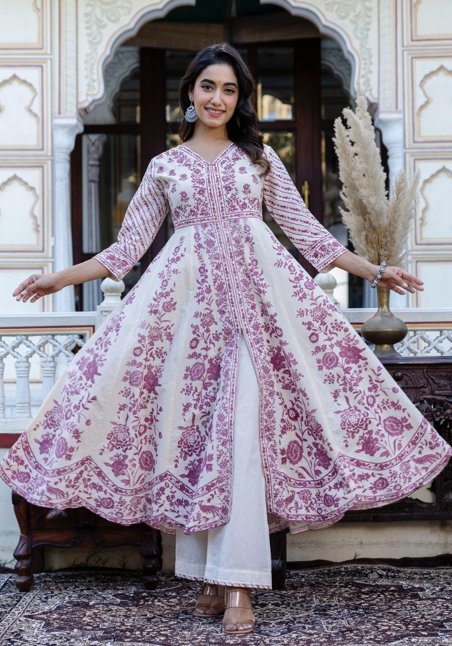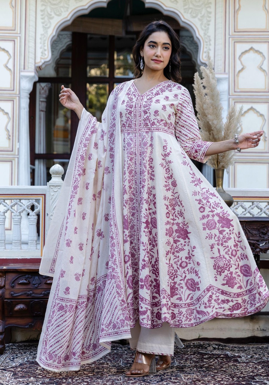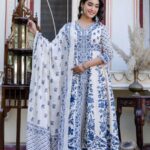 This grand Anarkali is crafted from premium soft dobby cotton, featuring a unique self-textured weave and timeless hand-block prints.