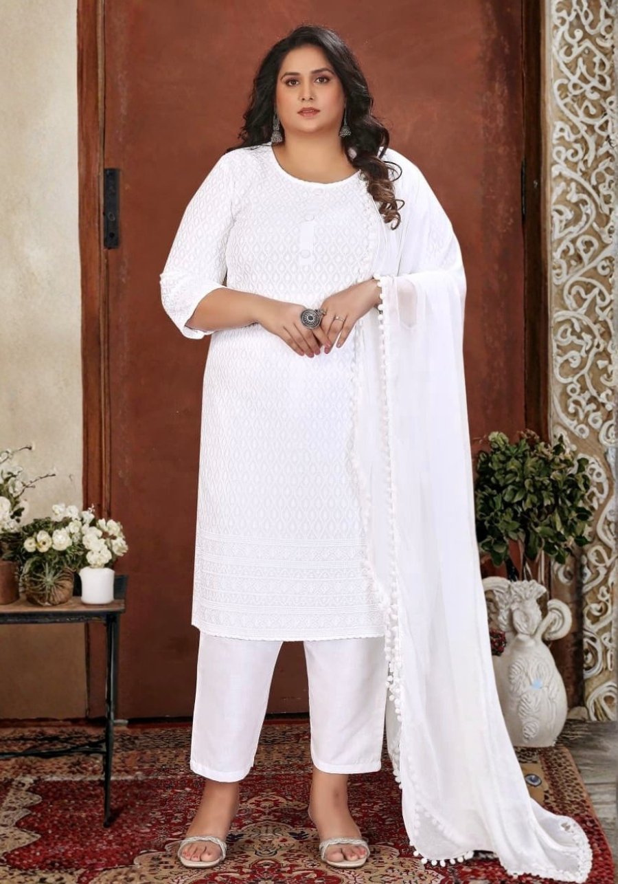 An elegant three-piece ensemble featuring a pure rayon kurti with all-over Chikankari embroidery on the front, back, and sleeves. Paired with comfortable rayon pants and a premium shawl, this set offers a sophisticated silhouette and a breathable fit for any occasion.