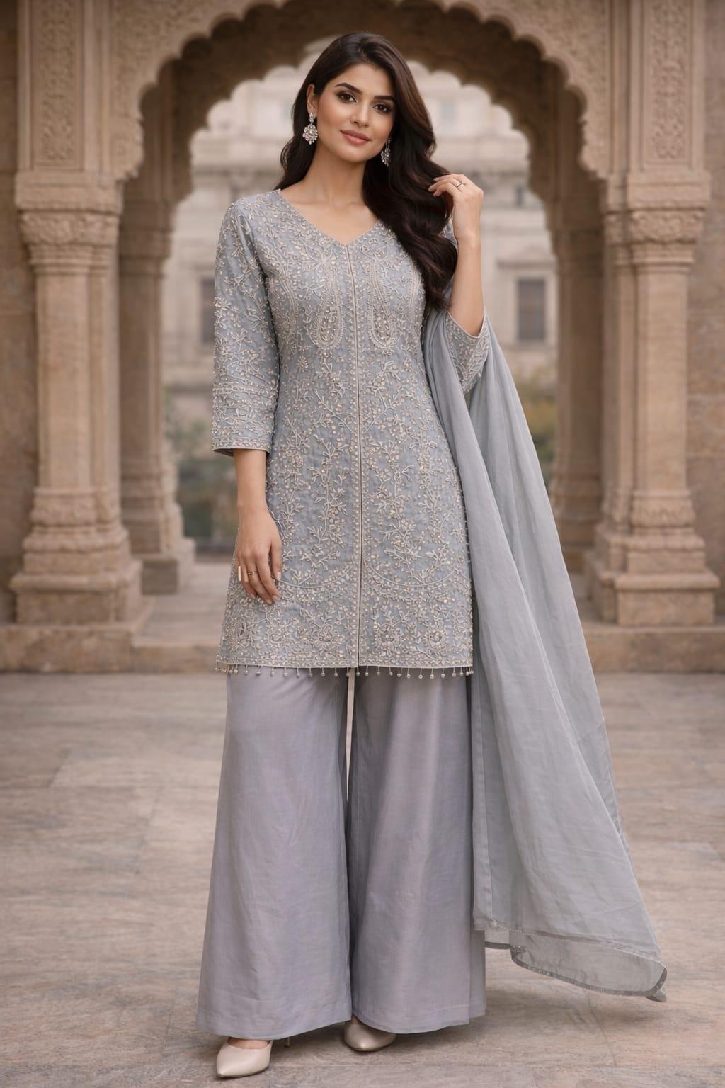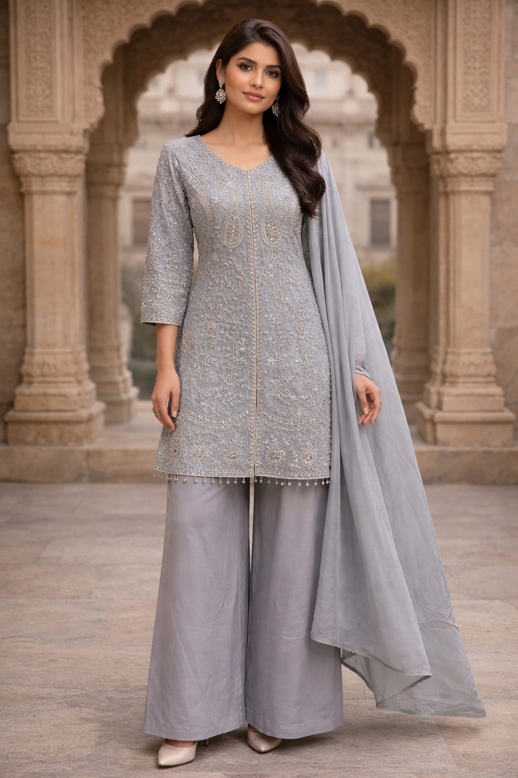 This ensemble features an elegant pure georgette kurta intricately detailed with paisley beadwork and delicate silver-lace accents. Designed as a complete three-piece set, it pairs a flowing palazzo with a matching shawl for a seamless, high-end silhouette.