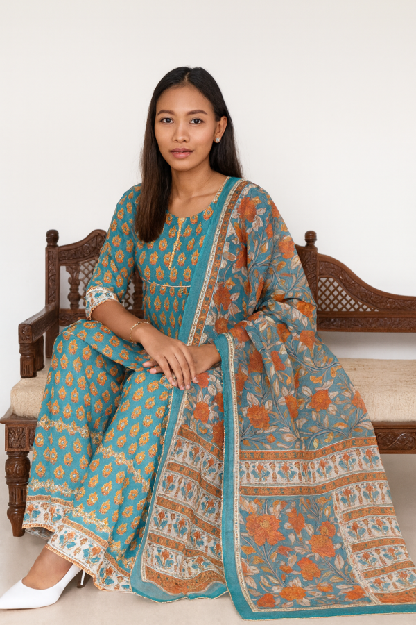 Teal Blue Straight Kurta Set With Shawl