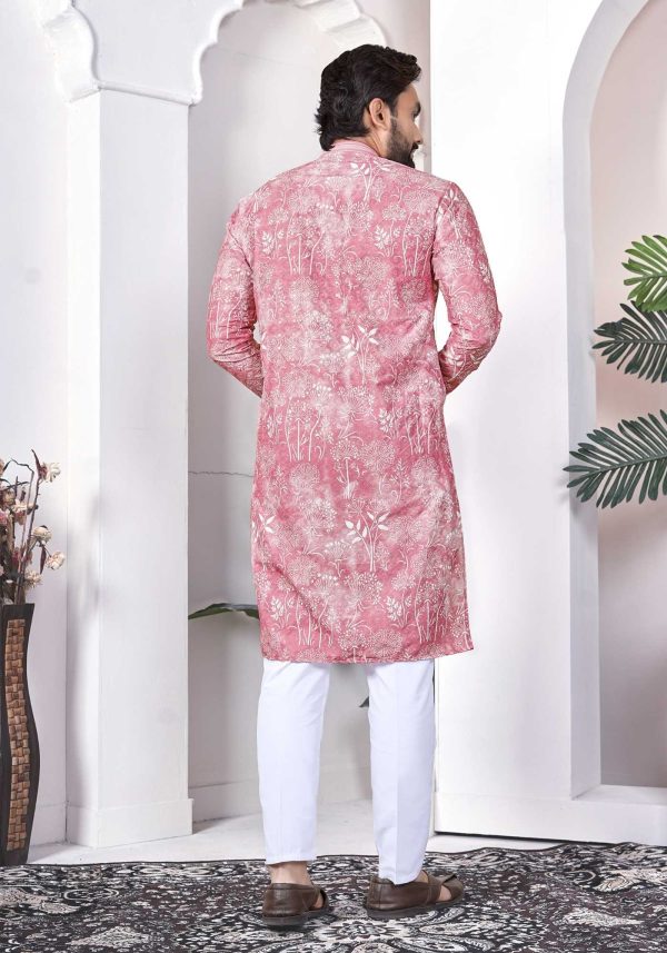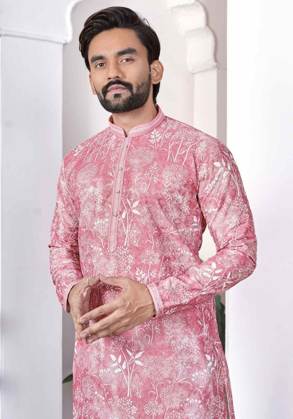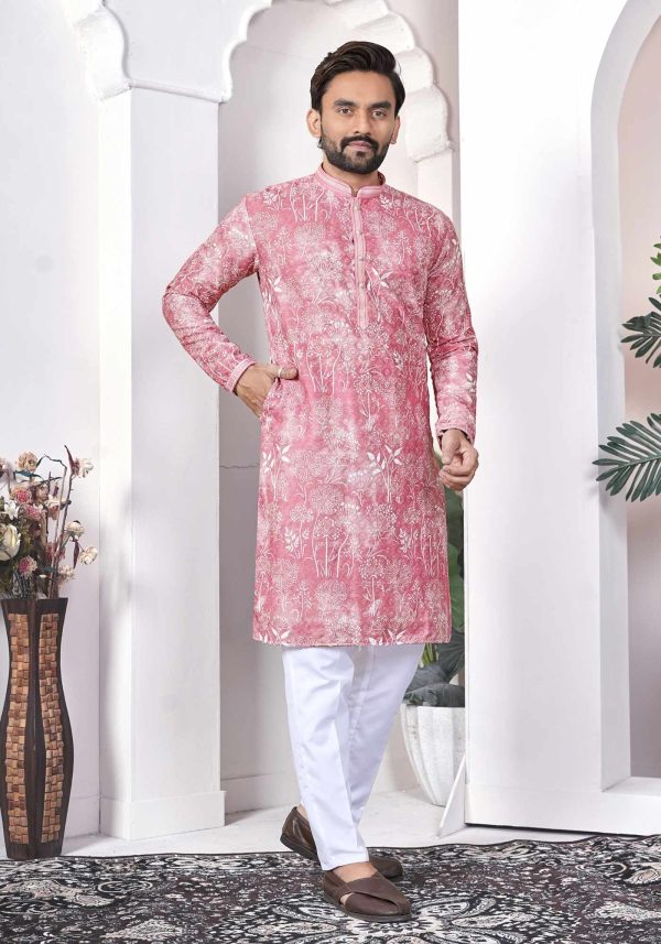 Redefine your ethnic wardrobe with this cotton long kurta featuring intricate Lucknowi work and extraordinary digital prints. This regal ensemble is finished with a silk-thread neck design and paired with matching cotton pajama pants.