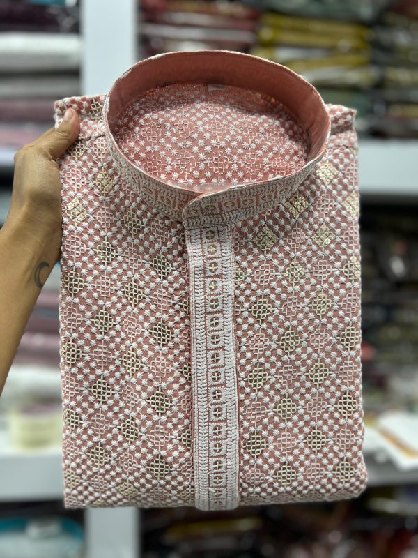 Luxurious Embroidered Kurta Pajama for Men in Quicksand Pink