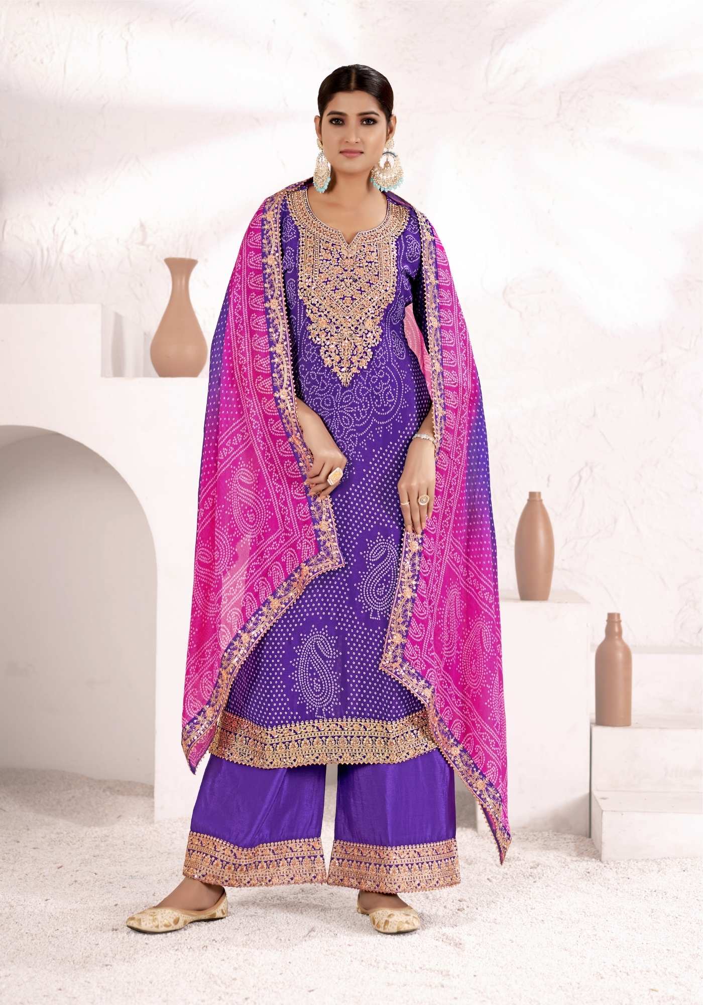 Showcase a sophisticated flair in this pure chinon palazzo set featuring a rich texture and contrast shawl. The fluid palazzo pants complement the top perfectly, offering a polished silhouette for formal occasions.