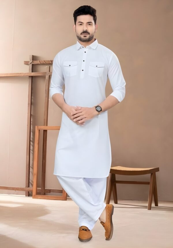Tailored in a classic long-style cut, the kurta provides a sharp, structured look. It is paired with a Cotton Pajama for a complete, cohesive ensemble. This collection brings a luxury look with the practical ease of cotton, making it an essential addition to your ethnic wardrobe.