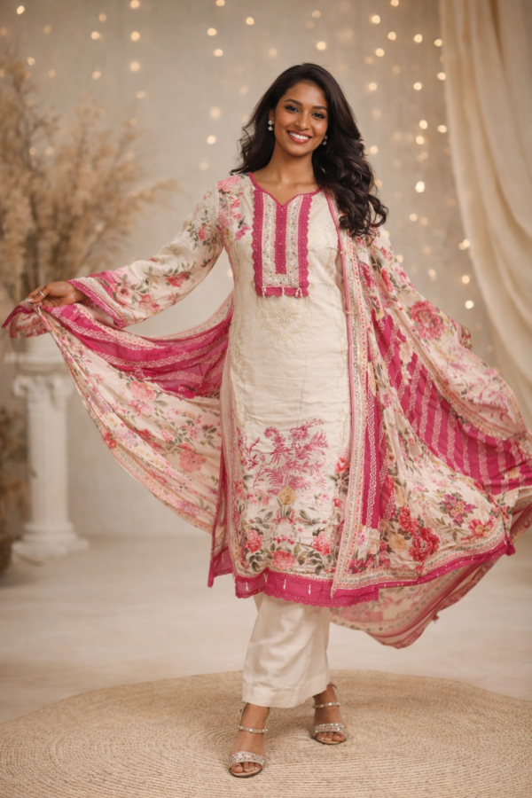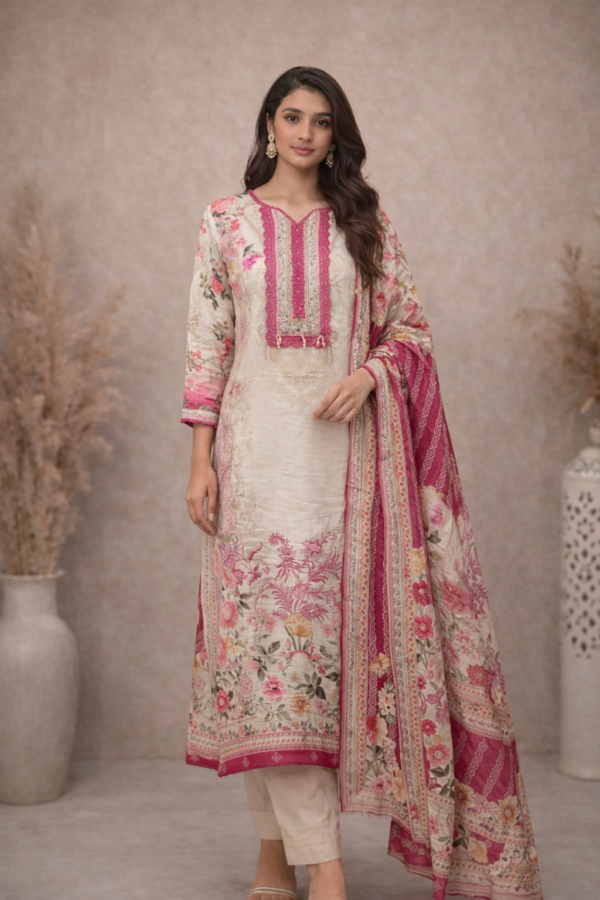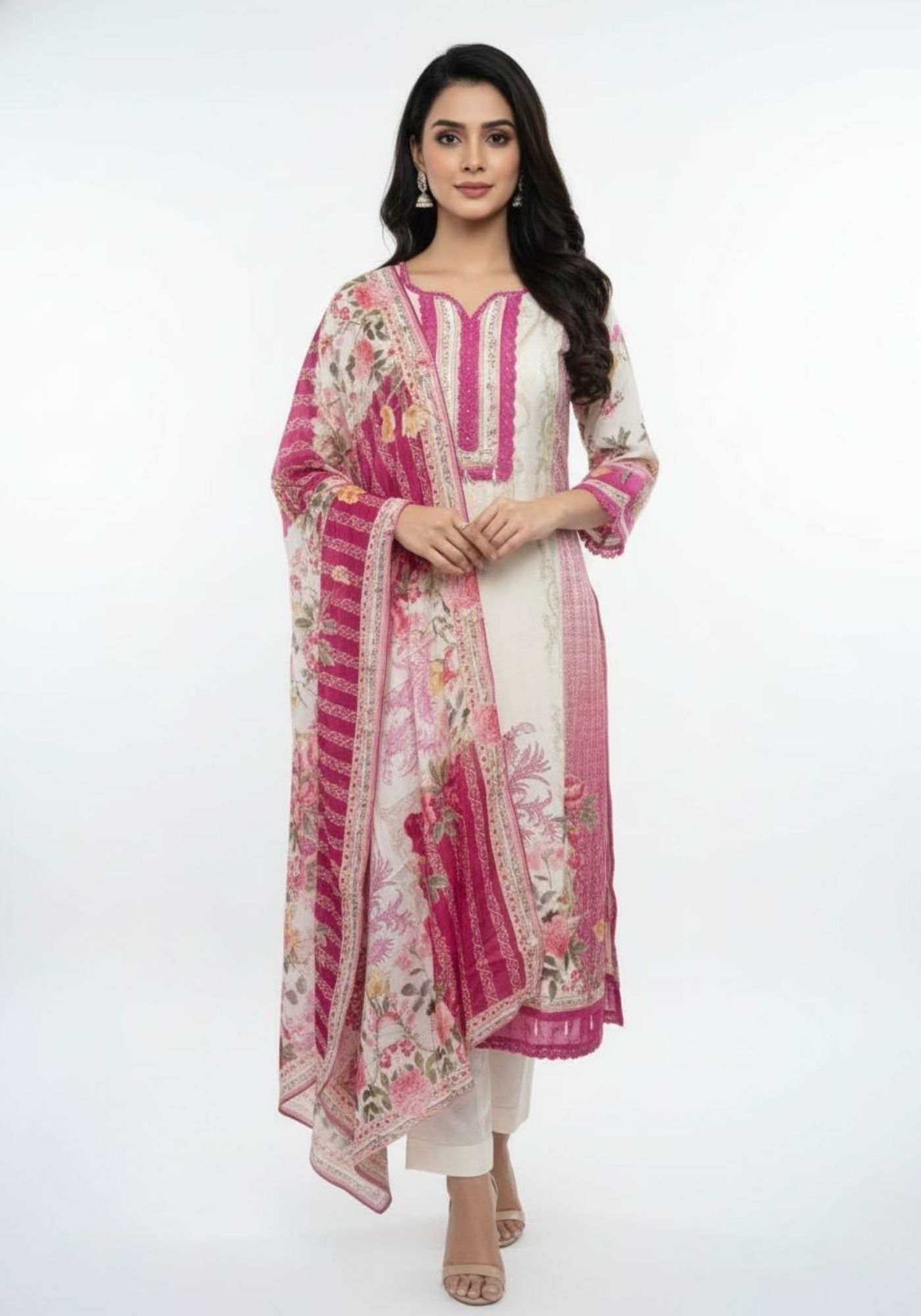 Upgrade your collection with this pure muslin top paired with soft santoon straight pants and a matching dupatta. This set offers a refined texture and a sleek, contemporary silhouette for any event.