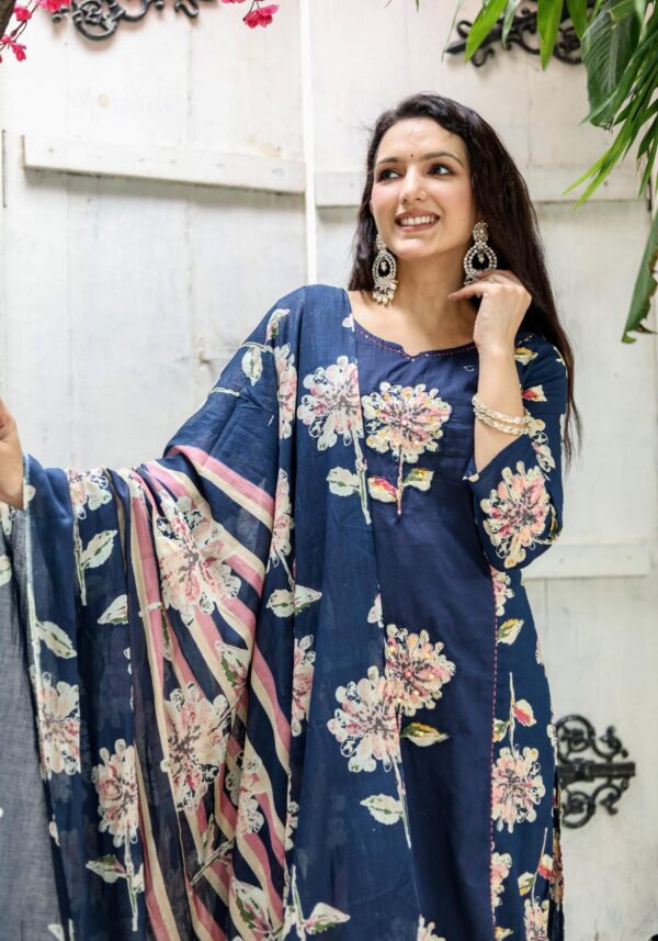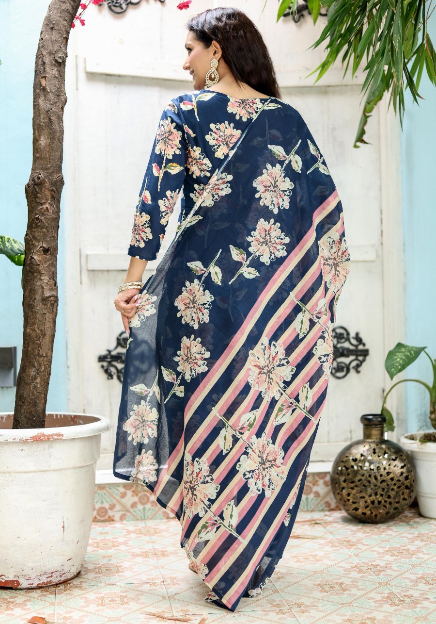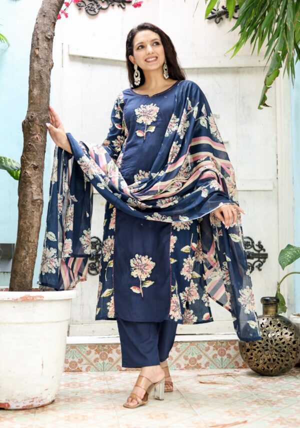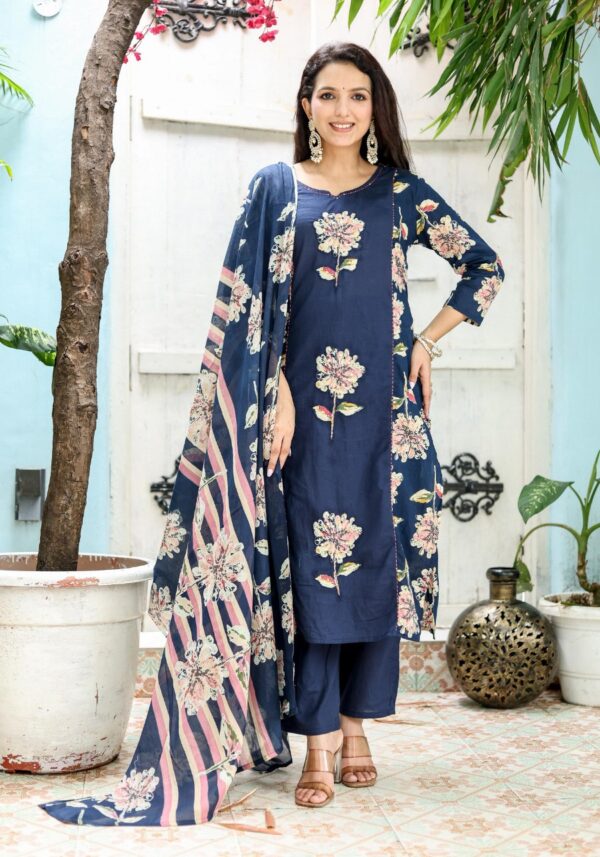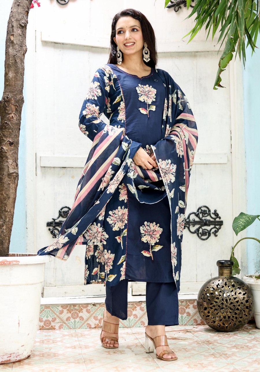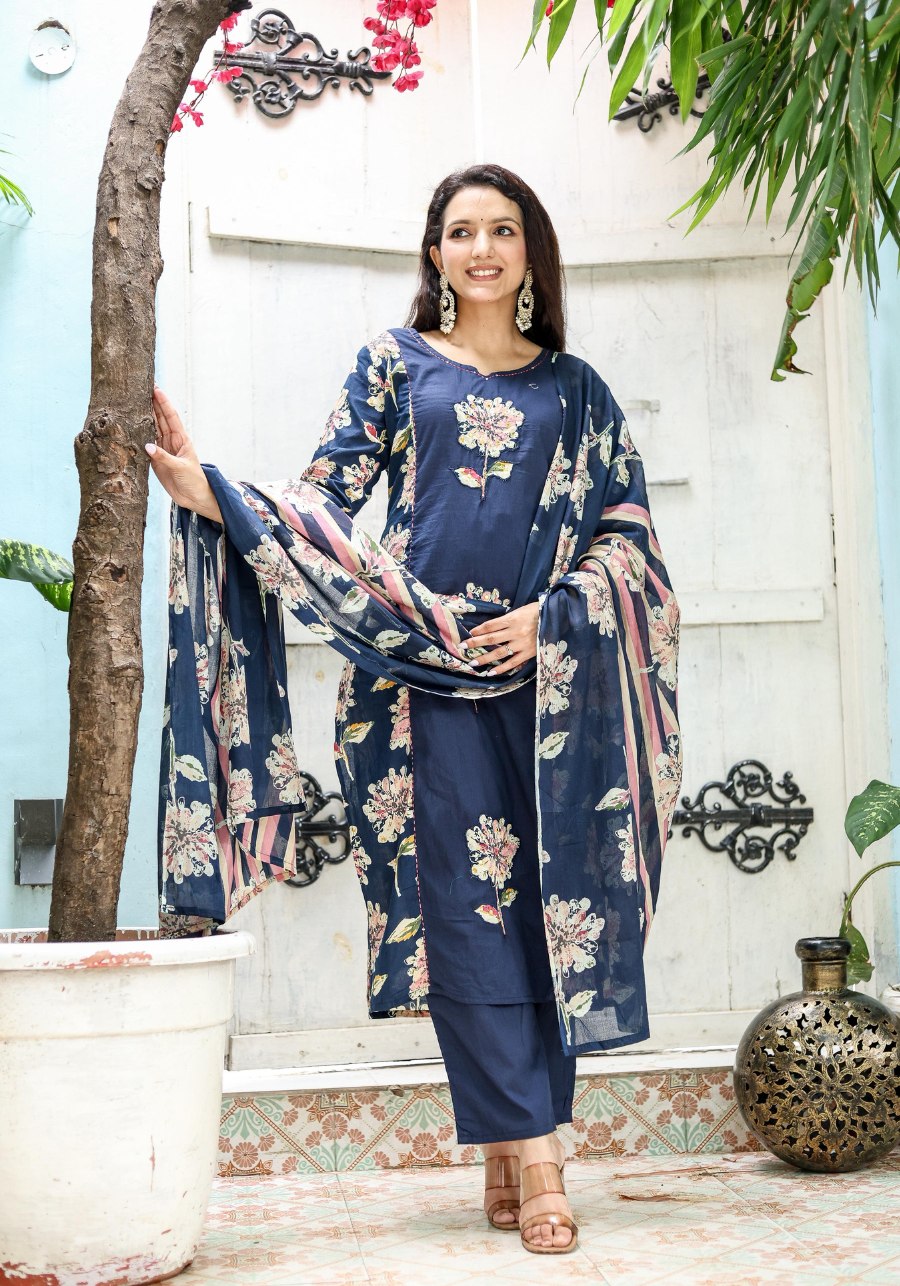 Elevate your ethnic wardrobe with a piece that commands attention. The SE110 features masterfully placed floral appliqué motifs on a midnight navy base, offering a contemporary take on traditional handwork.