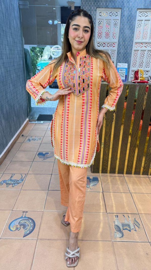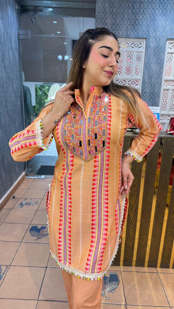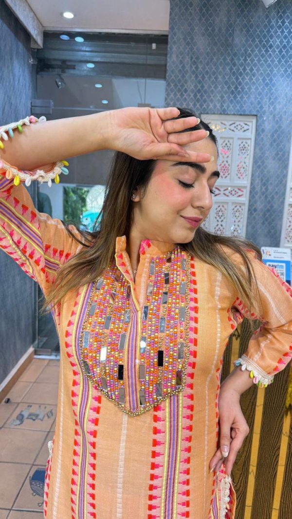 Premium self woven pattern pure cotton fabric, studded with real. mirror beaded hand work and catchy design !!