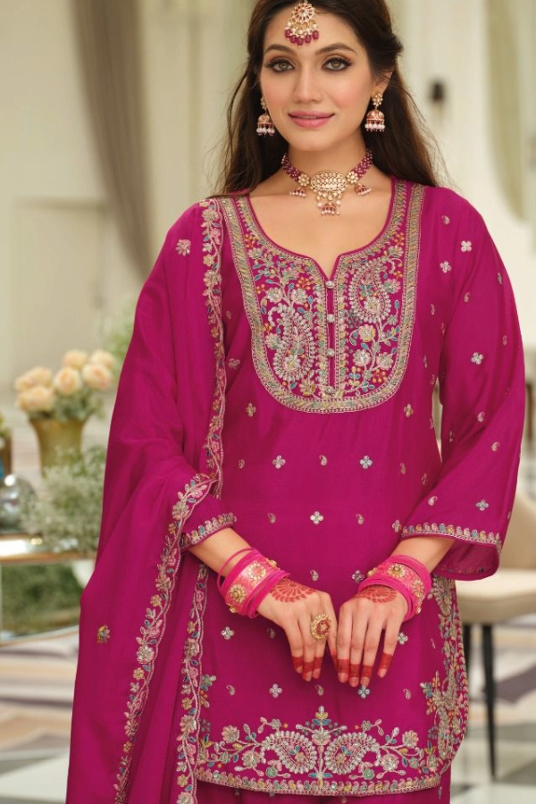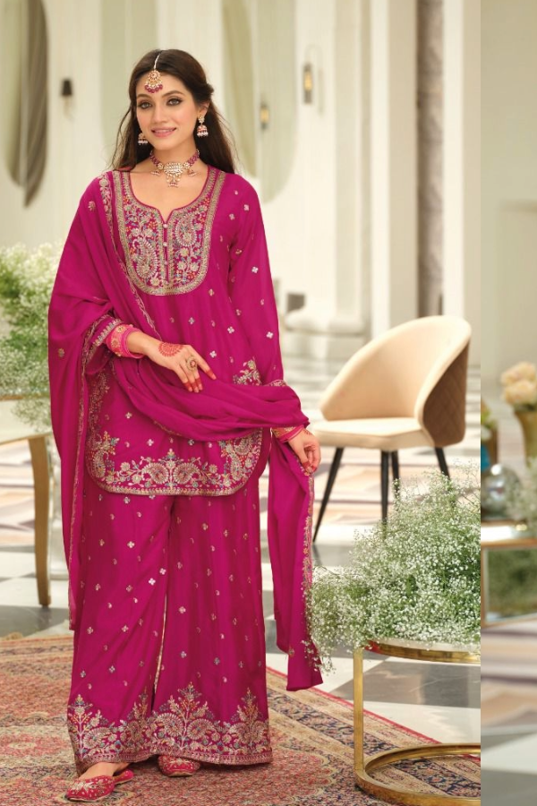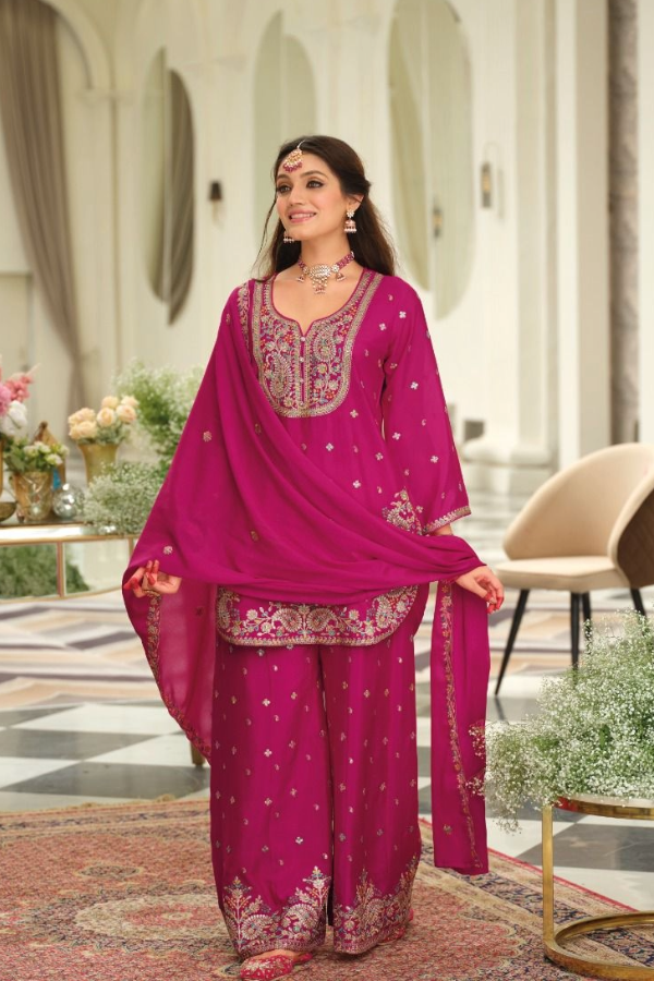 A gorgeous premium chinon silk kurti-palazzo set with embroidered dupatta that is comfy, playful and glamorous at the same time… this high quality piece is going to make you the showstopper during festivities….