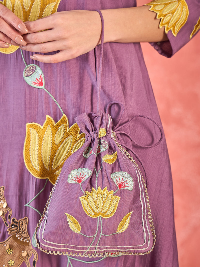 Embroidery, semi precious stone work and stitch with cute pouch makes it a masterpiece!!
