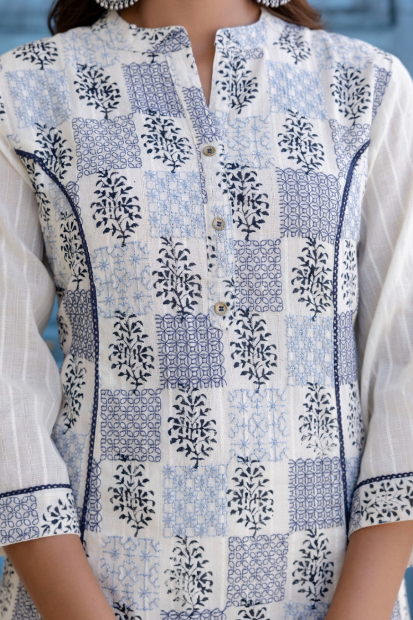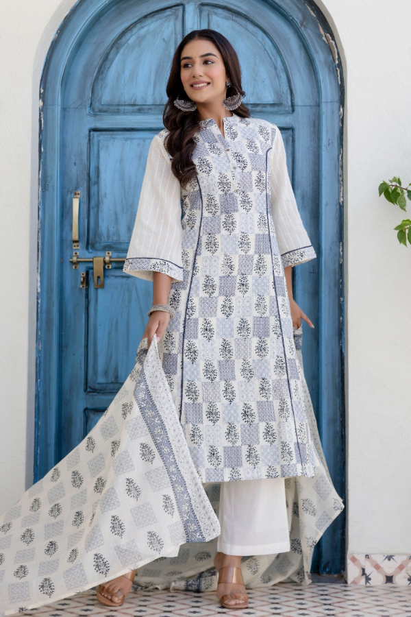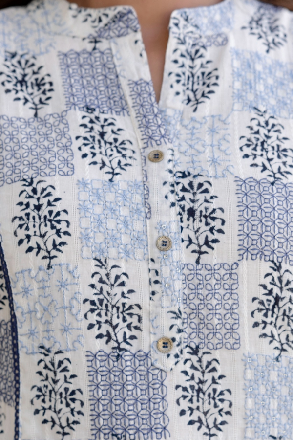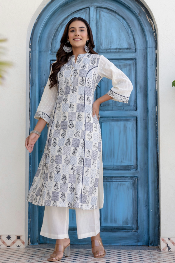 Soft linen-cotton with hand block print and embroidery, styled for minimalistic comfort.