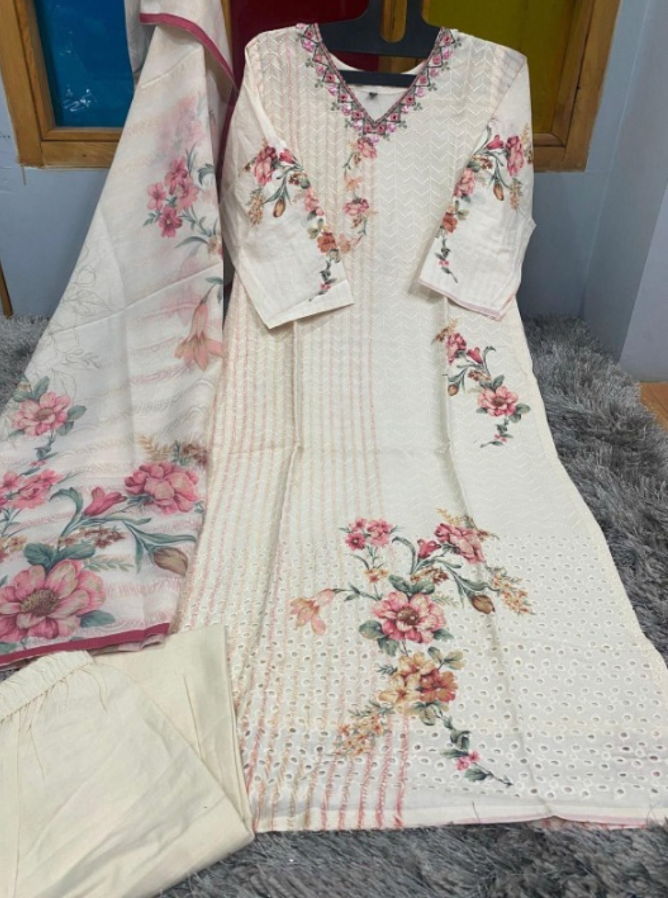 A 100% Cotton piece with catchy floral prints and hand embroidery