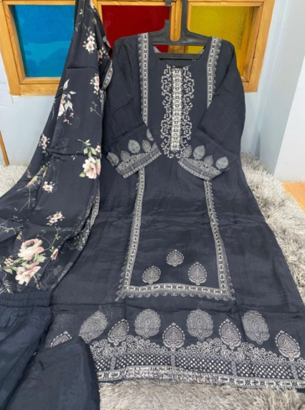 Luxury linen silk made masterpiece that has catchy hand embroidery and stunning dupatta