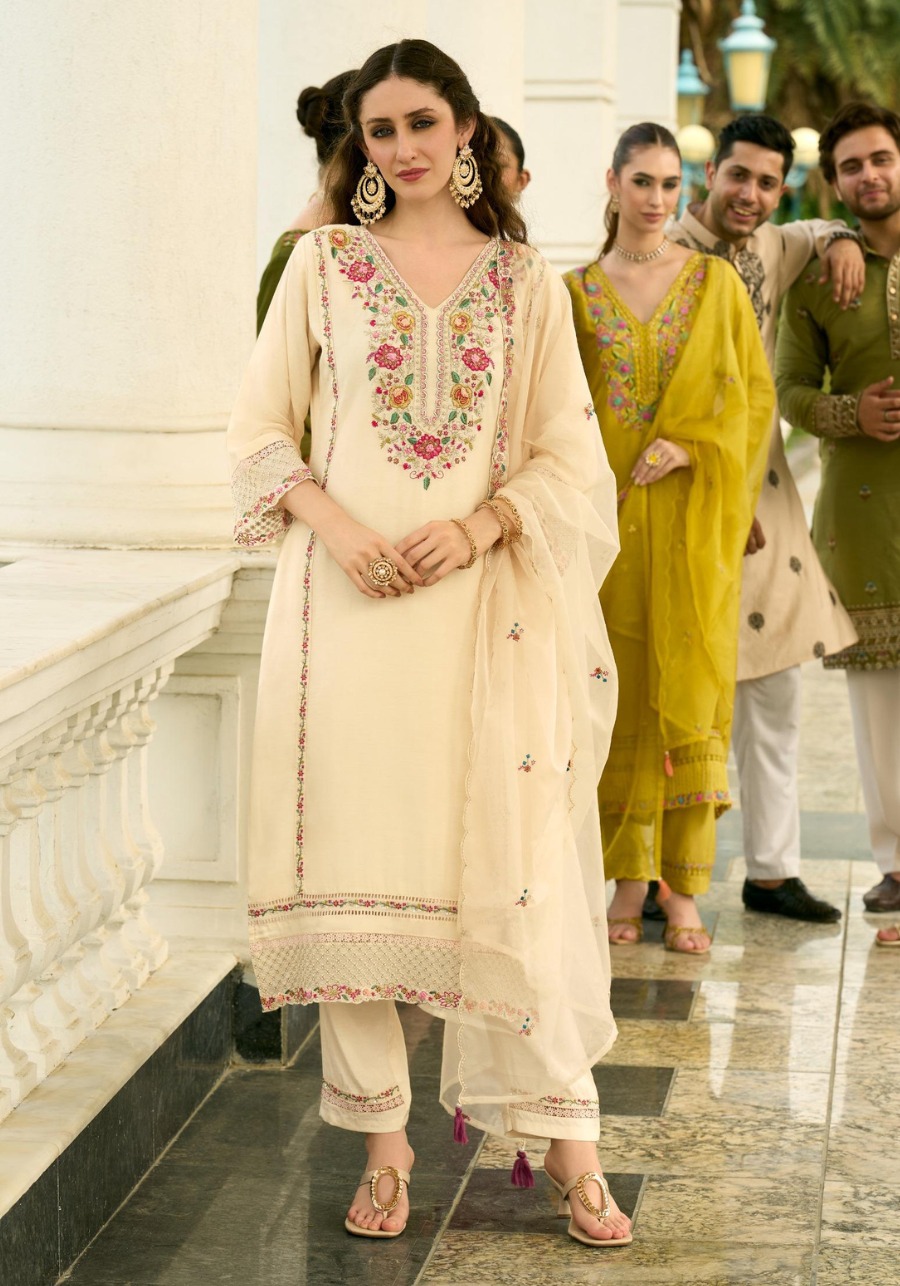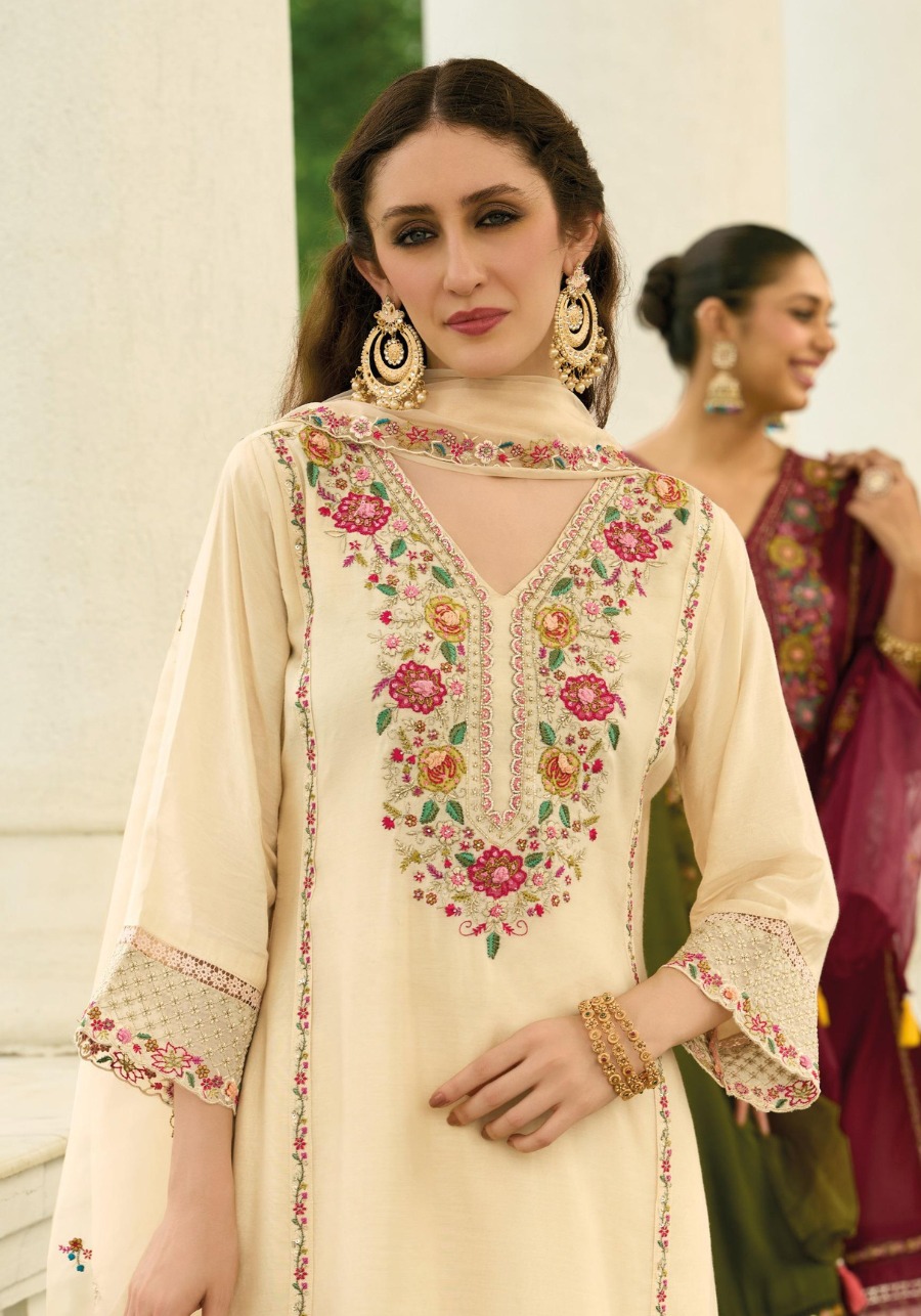 Step into a world of refined elegance with our pure mull chanderi hand work collection. This ensemble is a celebration of traditional craftsmanship blended with modern silhouettes, perfect for festive gatherings and special occasions.