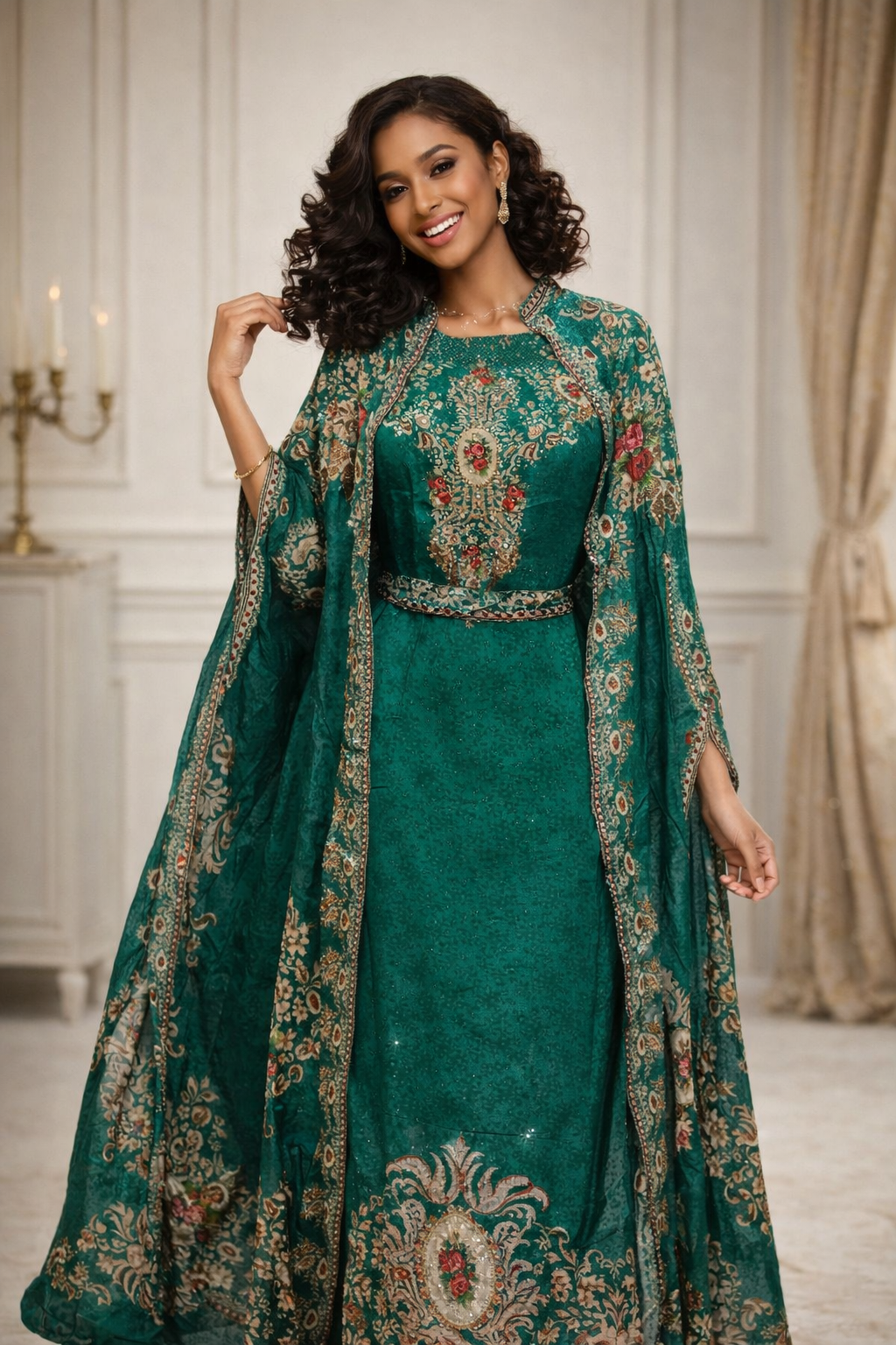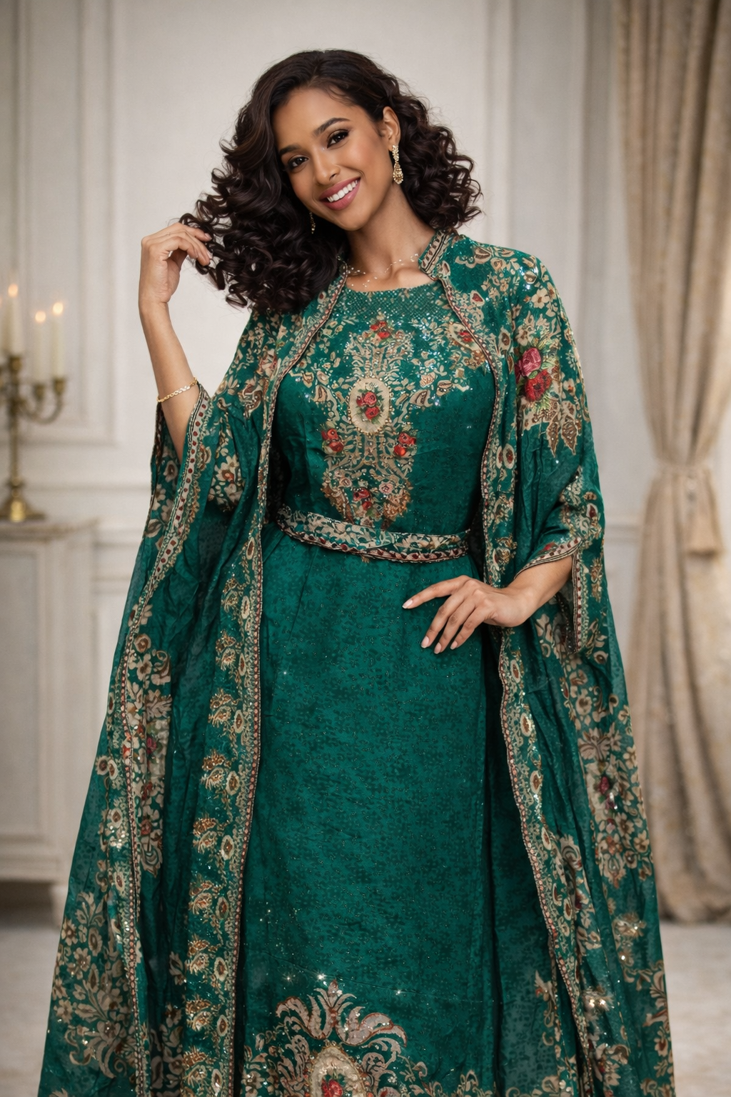 This elegant two-piece set is crafted from 100% pure natural crepe, offering a seamless blend of comfort and sophisticated drape. The coordinated kurti and shrug pairing features a soft, pebbled texture and a fluid silhouette that transitions effortlessly from day to evening.