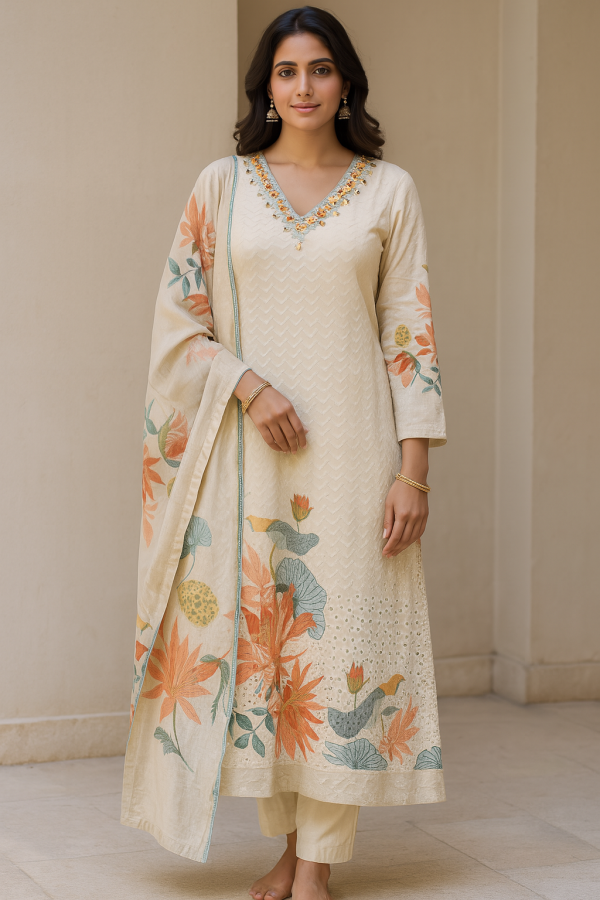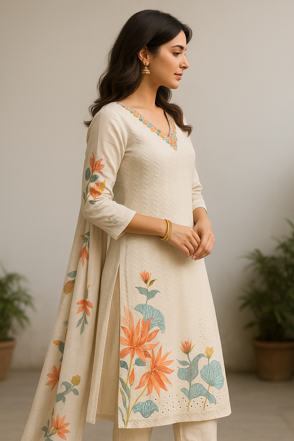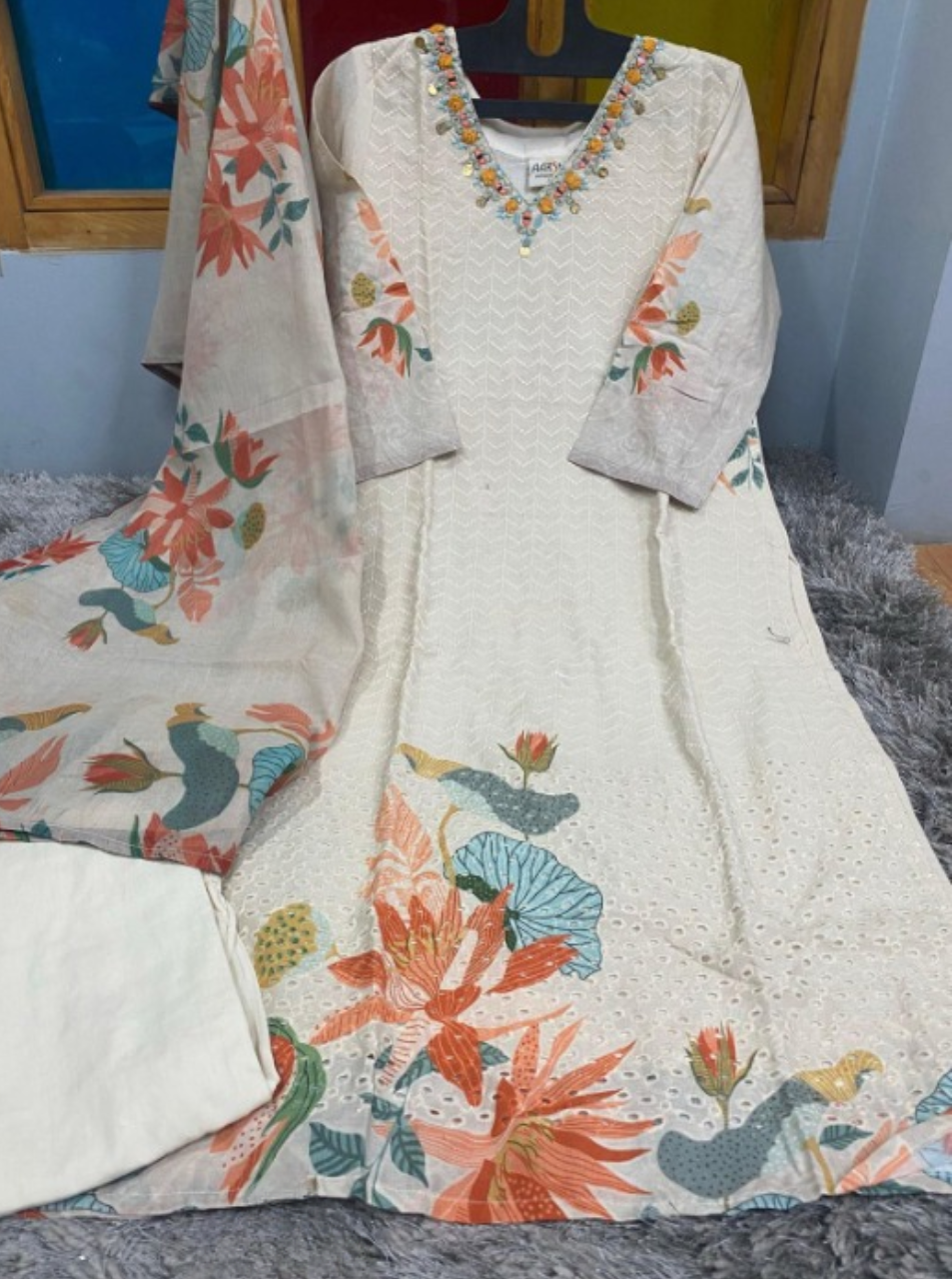 Overall hand embroidery done on pure cotton fabric, adorned with digital prints